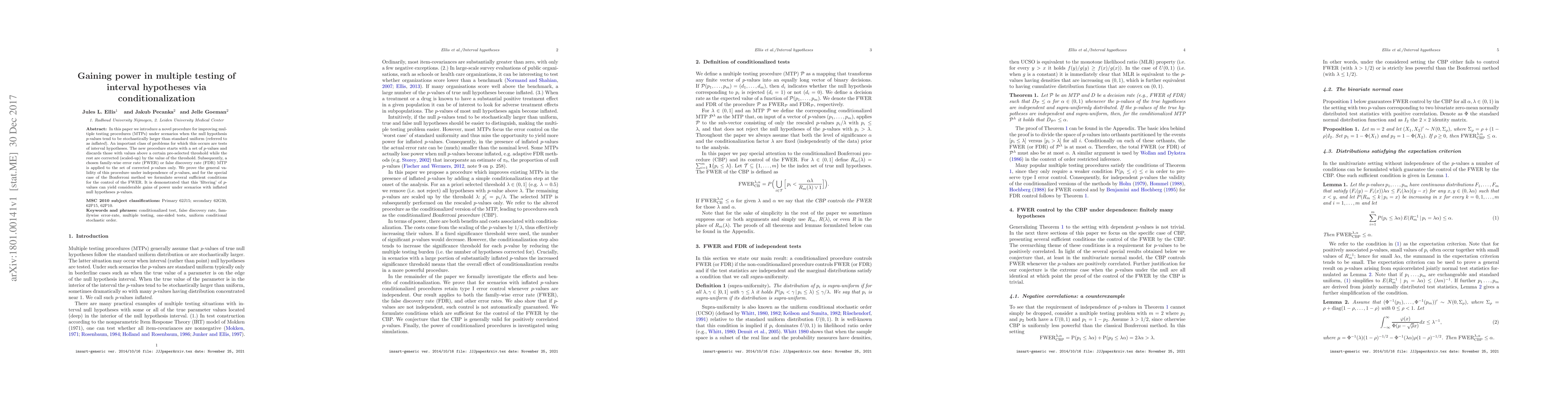 This paper proposes a novel multiple testing procedure that improves power by filtering and scaling inflated $p$-values before applying standard FWER or FDR methods, demonstrating significant gains in scenarios where null hypotheses $p$-values are larger than expected. The procedure is shown to be valid under independence and provides conditions for the Bonferroni method.