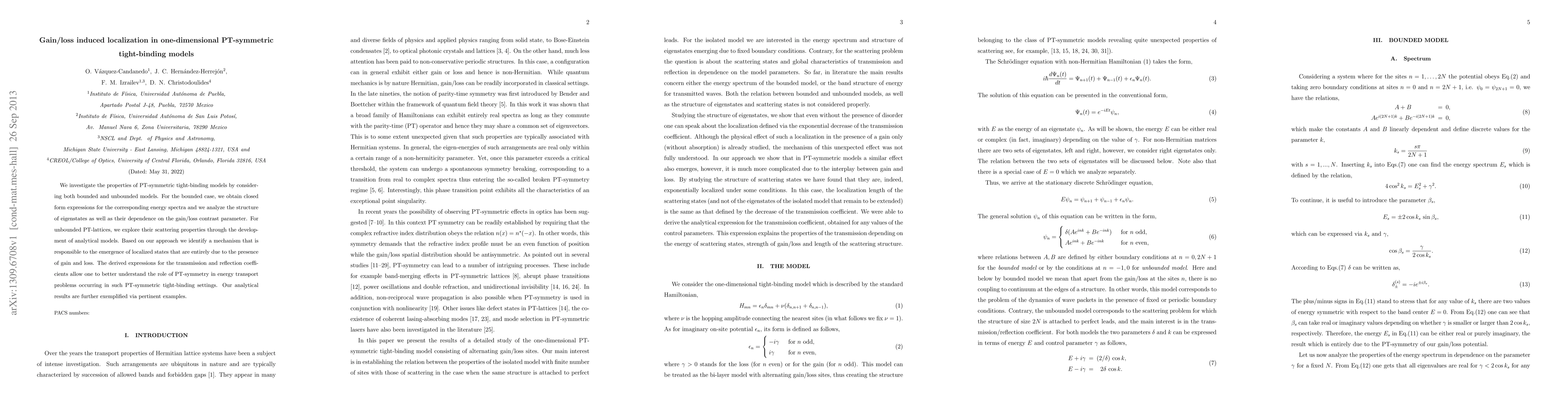 This paper explores PT-symmetric tight-binding models, deriving closed-form expressions for bounded cases and analytical models for unbounded ones. It identifies a mechanism for gain/loss-induced localization and elucidates the role of PT-symmetry in energy transport through transmission and reflection coefficient analysis.
