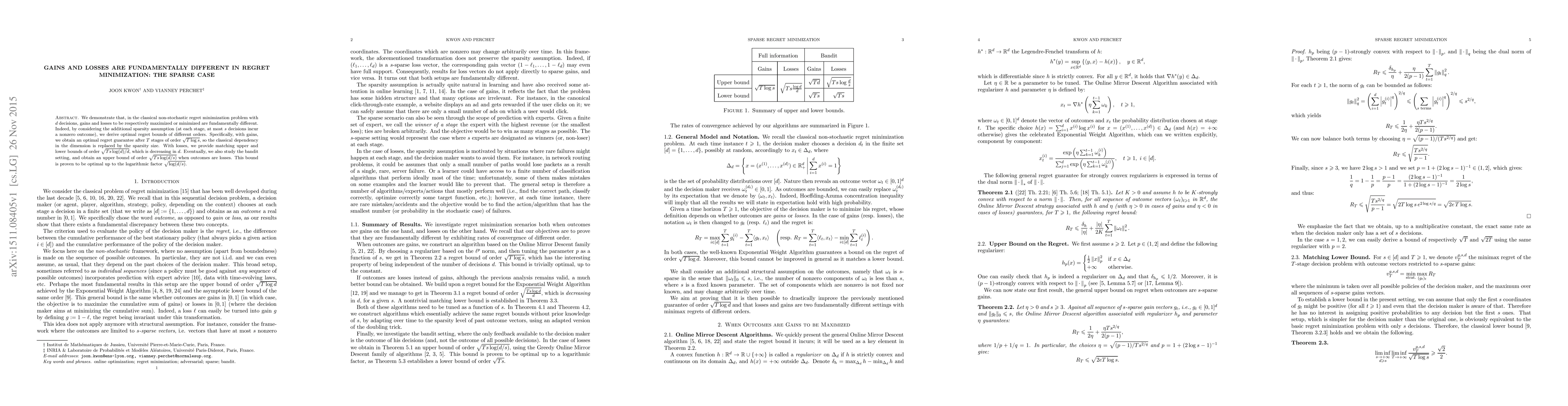 We demonstrate that, in the classical non-stochastic regret minimization problem with $d$ decisions, gains and losses to be respectively maximized or minimized are fundamentally different. Indeed, by considering the additional sparsity assumption (at each stage, at most $s$ decisions incur a nonzero outcome), we derive optimal regret bounds of different orders. Specifically, with gains, we obtain an optimal regret guarantee after $T$ stages of order $\sqrt{T\log s}$, so the classical dependency in the dimension is replaced by the sparsity size. With losses, we provide matching upper and lower bounds of order $\sqrt{Ts\log(d)/d}$, which is decreasing in $d$. Eventually, we also study the bandit setting, and obtain an upper bound of order $\sqrt{Ts\log (d/s)}$ when outcomes are losses. This bound is proven to be optimal up to the logarithmic factor $\sqrt{\log(d/s)}$.