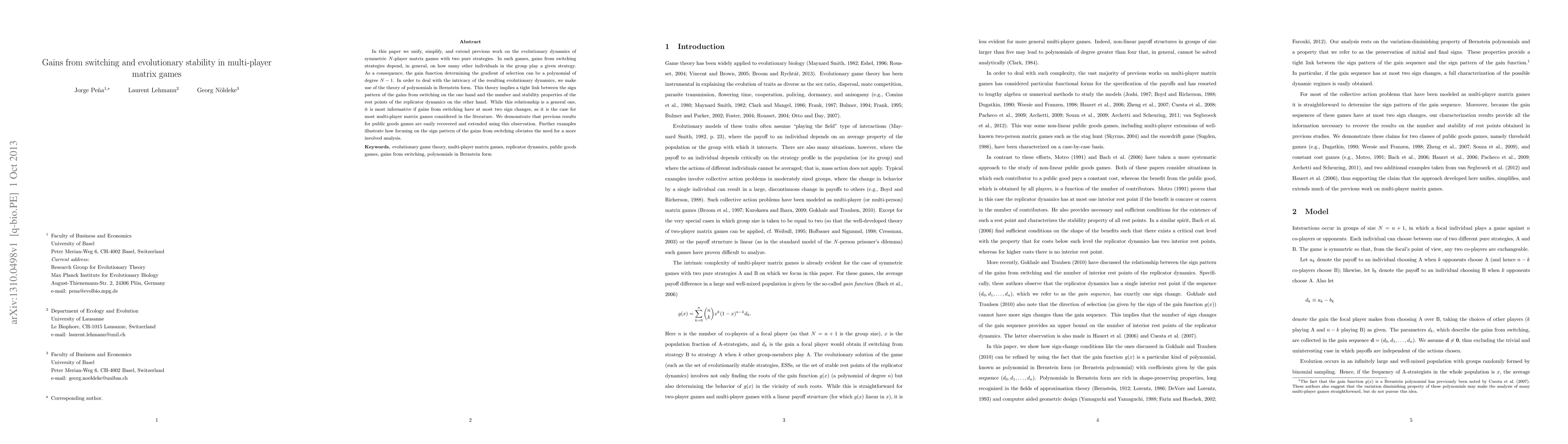 In this paper we unify, simplify, and extend previous work on the evolutionary dynamics of symmetric $N$-player matrix games with two pure strategies. In such games, gains from switching strategies depend, in general, on how many other individuals in the group play a given strategy. As a consequence, the gain function determining the gradient of selection can be a polynomial of degree $N-1$. In order to deal with the intricacy of the resulting evolutionary dynamics, we make use of the theory of polynomials in Bernstein form. This theory implies a tight link between the sign pattern of the gains from switching on the one hand and the number and stability properties of the rest points of the replicator dynamics on the other hand. While this relationship is a general one, it is most informative if gains from switching have at most two sign changes, as it is the case for most multi-player matrix games considered in the literature. We demonstrate that previous results for public goods games are easily recovered and extended using this observation. Further examples illustrate how focusing on the sign pattern of the gains from switching obviates the need for a more involved analysis.