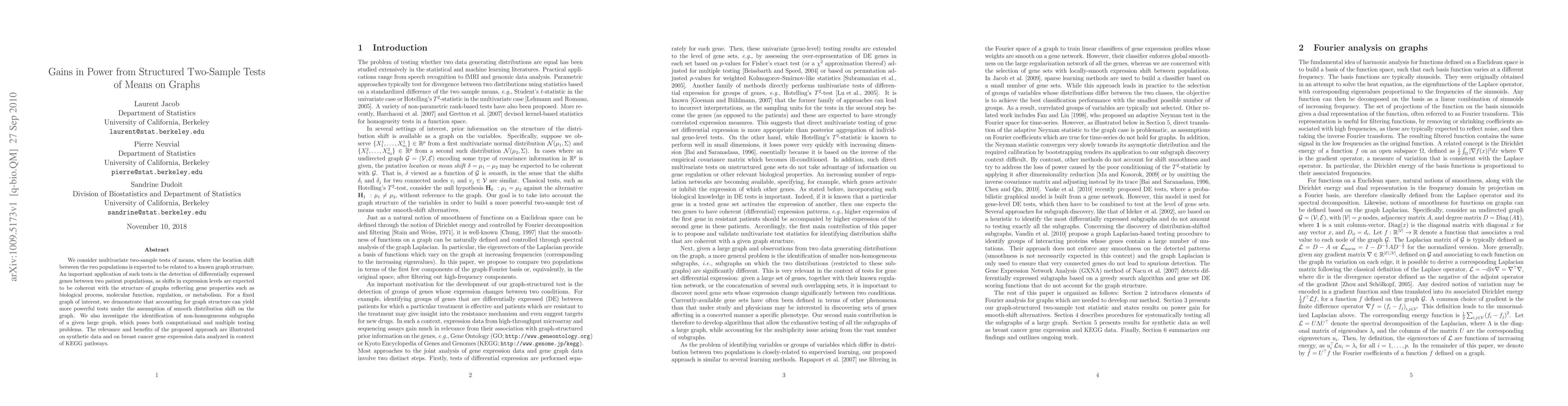 We consider multivariate two-sample tests of means, where the location shift between the two populations is expected to be related to a known graph structure. An important application of such tests is the detection of differentially expressed genes between two patient populations, as shifts in expression levels are expected to be coherent with the structure of graphs reflecting gene properties such as biological process, molecular function, regulation, or metabolism. For a fixed graph of interest, we demonstrate that accounting for graph structure can yield more powerful tests under the assumption of smooth distribution shift on the graph. We also investigate the identification of non-homogeneous subgraphs of a given large graph, which poses both computational and multiple testing problems. The relevance and benefits of the proposed approach are illustrated on synthetic data and on breast cancer gene expression data analyzed in context of KEGG pathways.