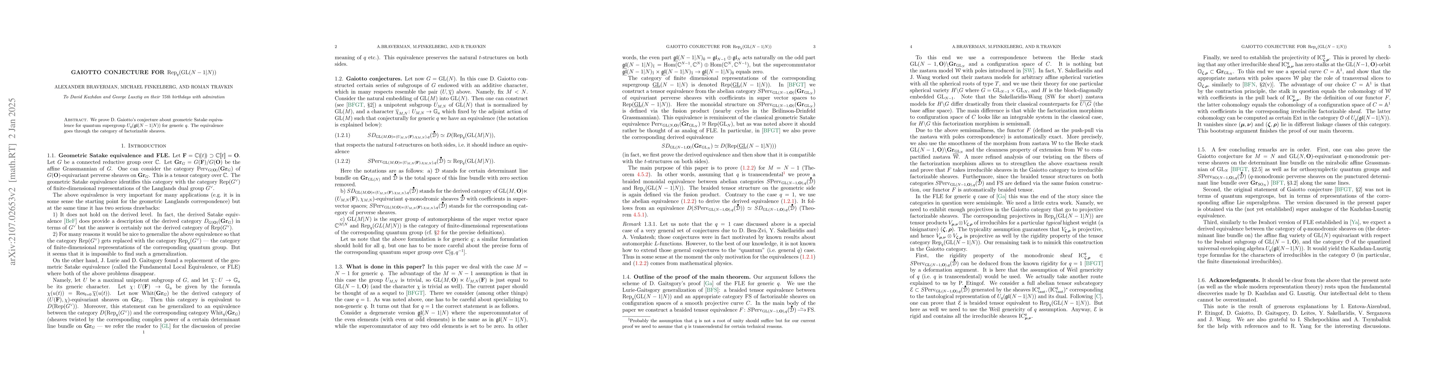 We prove D.Gaiotto's conjecture about geometric Satake equivalence for quantum supergroup $U_q({\mathfrak{gl}}(N-1|N))$ for generic $q$. The equivalence goes through the category of factorizable sheaves.