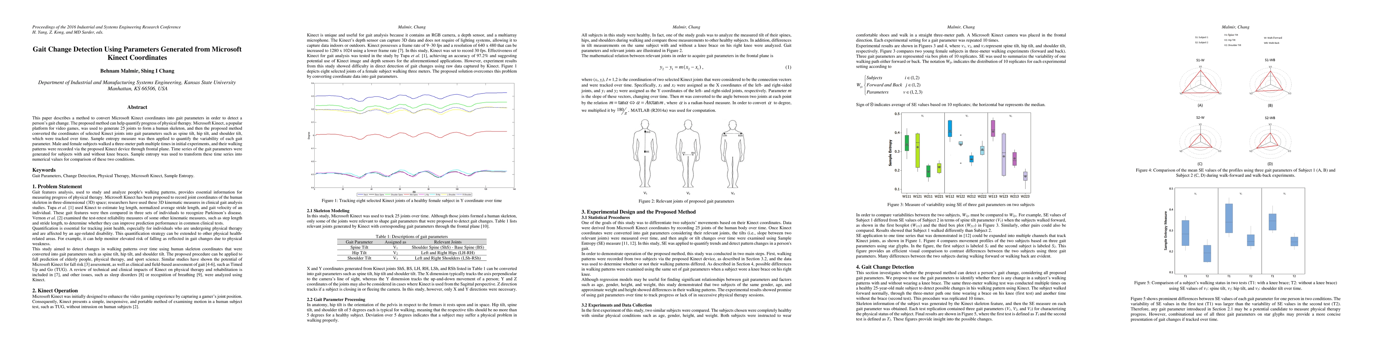 This paper describes a method to convert Microsoft Kinect coordinates into gait parameters in order to detect a person's gait change. The proposed method can help quantify the progress of physical therapy. Microsoft Kinect, a popular platform for video games, was used to generate 25 joints to form a human skeleton, and then the proposed method converted the coordinates of selected Kinect joints into gait parameters such as spine tilt, hip tilt, and shoulder tilt, which were tracked over time. Sample entropy measure was then applied to quantify the variability of each gait parameter. Male and female subjects walked a three-meter path multiple times in initial experiments, and their walking patterns were recorded via the proposed Kinect device through the frontal plane. Time series of the gait parameters were generated for subjects with and without knee braces. Sample entropy was used to transform these time series into numerical values for comparison of these two conditions.