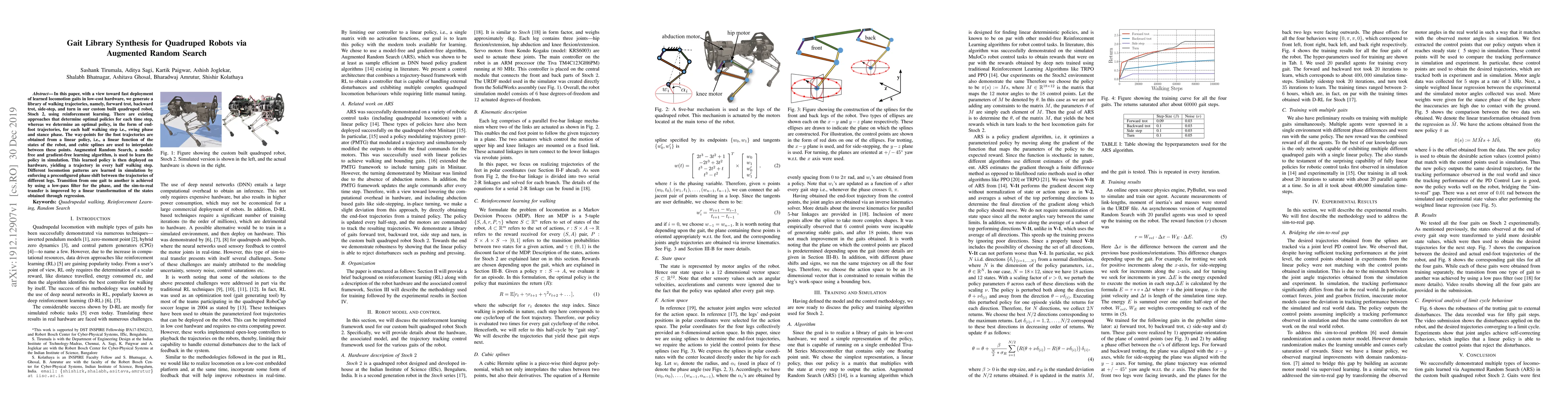 Researchers developed a library of walking trajectories for quadruped robots using reinforcement learning and augmented random search, enabling fast deployment of learned locomotion gaits in low-cost hardware.