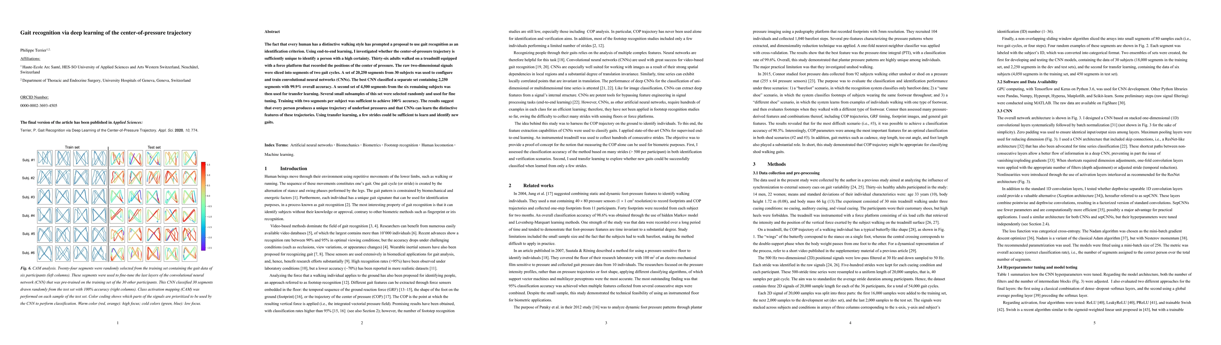 The fact that every human has a distinctive walking style has prompted a proposal to use gait recognition as an identification criterion. Using end-to-end learning, I investigated whether the center-of-pressure trajectory is sufficiently unique to identify a person with a high certainty. Thirty-six adults walked on a treadmill equipped with a force platform that recorded the positions of the center of pressure. The raw two-dimensional signals were sliced into segments of two gait cycles. A set of 20,250 segments from 30 subjects was used to configure and train convolutional neural networks (CNNs). The best CNN classified a separate set containing 2,250 segments with 99.9% overall accuracy. A second set of 4,500 segments from the six remaining subjects was then used for transfer learning. Several small subsamples of this set were selected randomly and used for fine tuning. Training with two segments per subject was sufficient to achieve 100% accuracy. The results suggest that every person produces a unique trajectory of underfoot pressures and that CNNs can learn the distinctive features of these trajectories. Using transfer learning, a few strides could be sufficient to learn and identify new gaits.