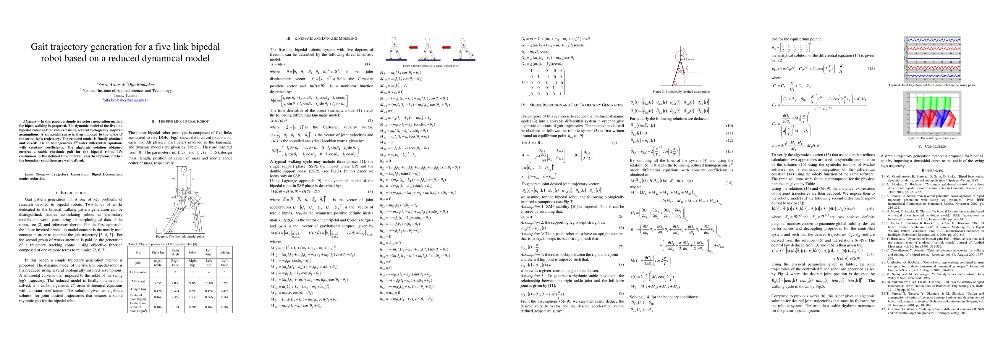 The paper presents a reduced dynamical model and its algebraic solution for gait trajectory generation in a five-link bipedal robot, simplifying the process and ensuring stability.