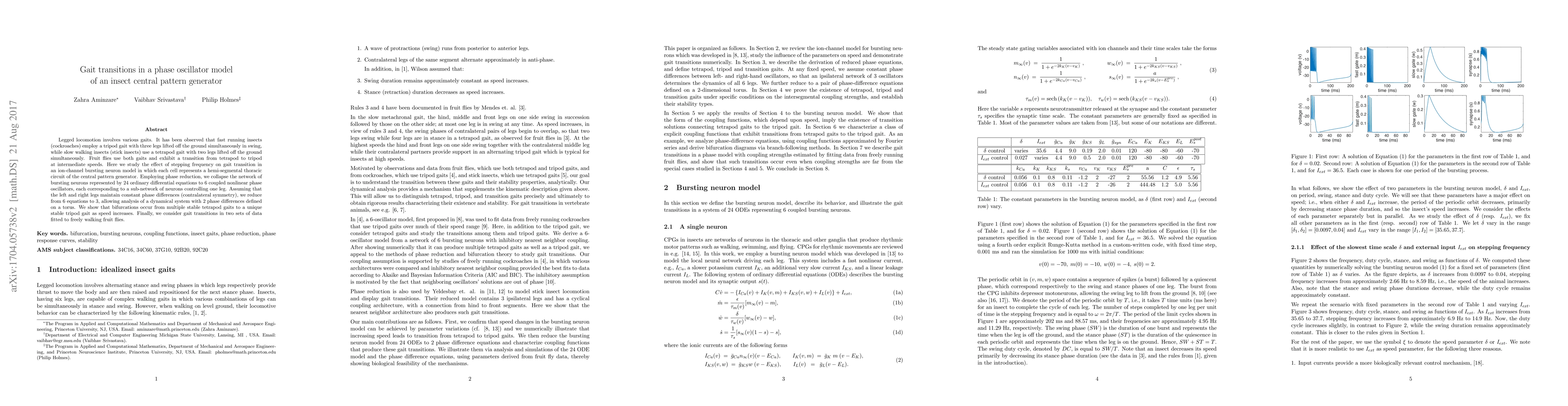 Legged locomotion involves various gaits. It has been observed that fast running insects (cockroaches) employ a tripod gait with three legs lifted off the ground simultaneously in swing, while slow walking insects (stick insects) use a tetrapod gait with two legs lifted off the ground simultaneously. Fruit flies use both gaits and exhibit a transition from tetrapod to tripod at intermediate speeds. Here we study the effect of stepping frequency on gait transition in an ion-channel bursting neuron model in which each cell represents a hemi-segmental thoracic circuit of the central pattern generator. Employing phase reduction, we collapse the network of bursting neurons represented by 24 ordinary differential equations to 6 coupled nonlinear phase oscillators, each corresponding to a sub-network of neurons controlling one leg. Assuming that the left and right legs maintain constant phase differences (contralateral symmetry), we reduce from 6 equations to 3, allowing analysis of a dynamical system with 2 phase differences defined on a torus. We show that bifurcations occur from multiple stable tetrapod gaits to a unique stable tripod gait as speed increases. Finally, we consider gait transitions in two sets of data fitted to freely walking fruit flies.