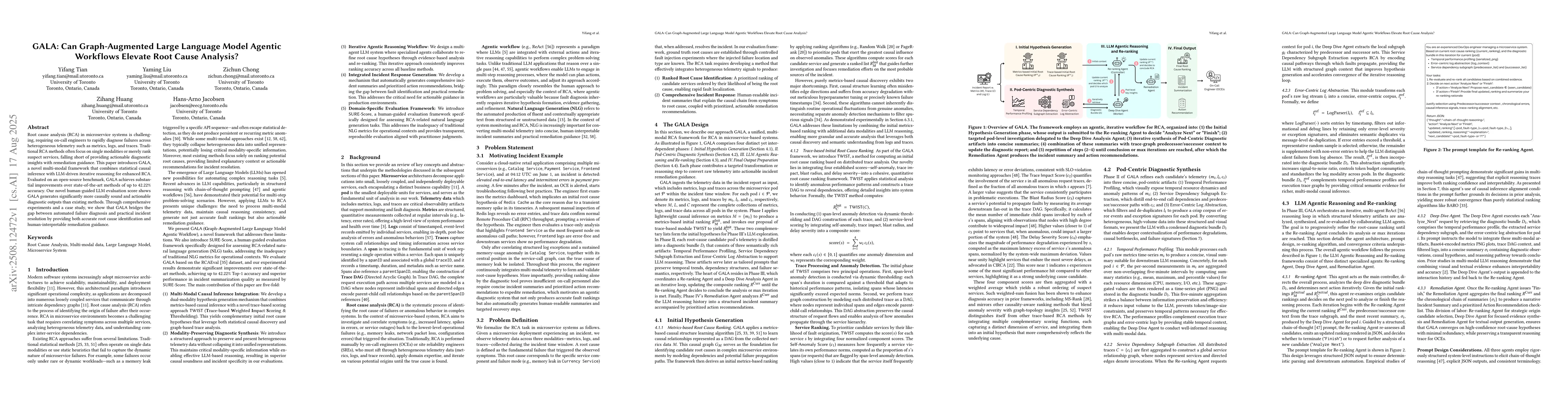 Root cause analysis (RCA) in microservice systems is challenging, requiring on-call engineers to rapidly diagnose failures across heterogeneous telemetry such as metrics, logs, and traces. Traditional RCA methods often focus on single modalities or merely rank suspect services, falling short of providing actionable diagnostic insights with remediation guidance. This paper introduces GALA, a novel multi-modal framework that combines statistical causal inference with LLM-driven iterative reasoning for enhanced RCA. Evaluated on an open-source benchmark, GALA achieves substantial improvements over state-of-the-art methods of up to 42.22% accuracy. Our novel human-guided LLM evaluation score shows GALA generates significantly more causally sound and actionable diagnostic outputs than existing methods. Through comprehensive experiments and a case study, we show that GALA bridges the gap between automated failure diagnosis and practical incident resolution by providing both accurate root cause identification and human-interpretable remediation guidance.