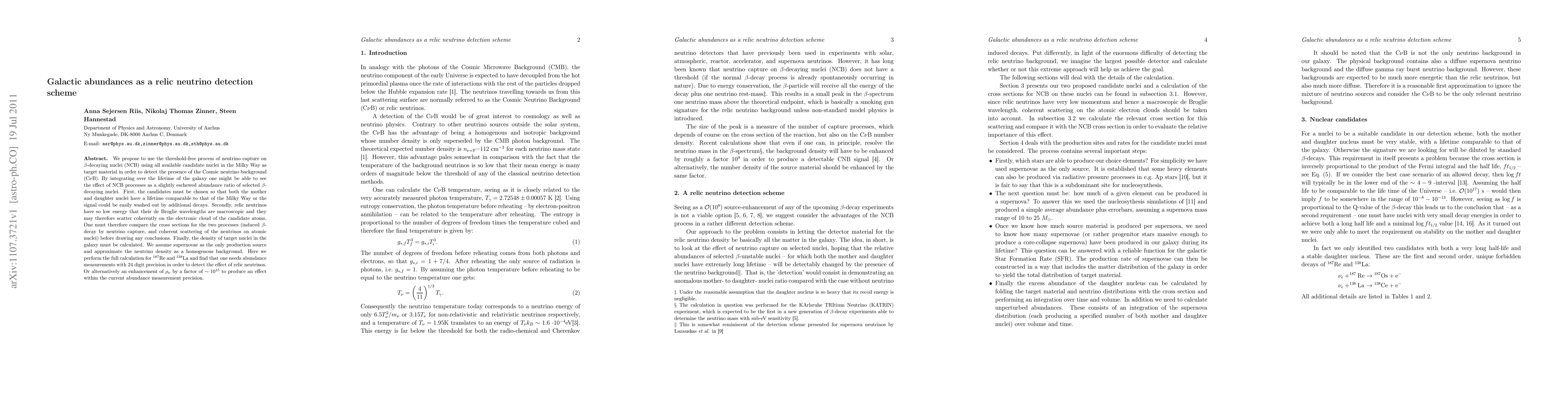 We propose to use the threshold-free process of neutrino capture on beta-decaying nuclei (NCB) using all available candidate nuclei in the Milky Way as target material in order to detect the presence of the Cosmic neutrino background. By integrating over the lifetime of the galaxy one might be able to see the effect of NCB processes as a slightly eschewed abundance ratio of selected beta-decaying nuclei. First, the candidates must be chosen so that both the mother and daughter nuclei have a lifetime comparable to that of the Milky Way or the signal could be easily washed out by additional decays. Secondly, relic neutrinos have so low energy that their de Broglie wavelengths are macroscopic and they may therefore scatter coherently on the electronic cloud of the candidate atoms. One must therefore compare the cross sections for the two processes (induced beta-decay by neutrino capture, and coherent scattering of the neutrinos on atomic nuclei) before drawing any conclusions. Finally, the density of target nuclei in the galaxy must be calculated. We assume supernovae as the only production source and approximate the neutrino density as a homogenous background. Here we perform the full calculation for 187-Re and 138-La and find that one needs abundance measurements with 24 digit precision in order to detect the effect of relic neutrinos. Or alternatively an enhancement of of the relic neutrino density by a factor of $10^{15}$ to produce an effect within the current abundance measurement precision.