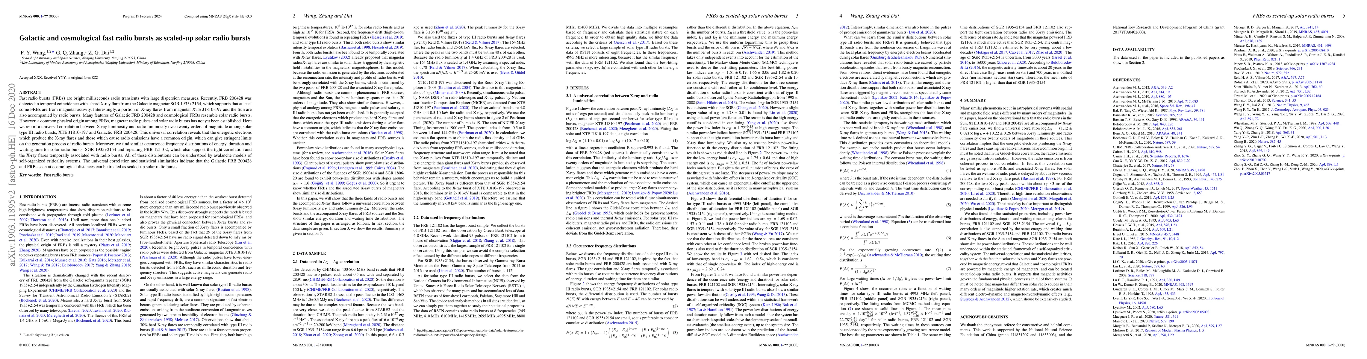 This paper establishes a universal correlation between X-ray and radio luminosities across solar, magnetar, and fast radio bursts, suggesting that Galactic and cosmological FRBs may be scaled-up versions of solar radio bursts. The study supports a common physical origin for these phenomena, revealing stringent limits on their generation processes and indicating a self-organized criticality system.