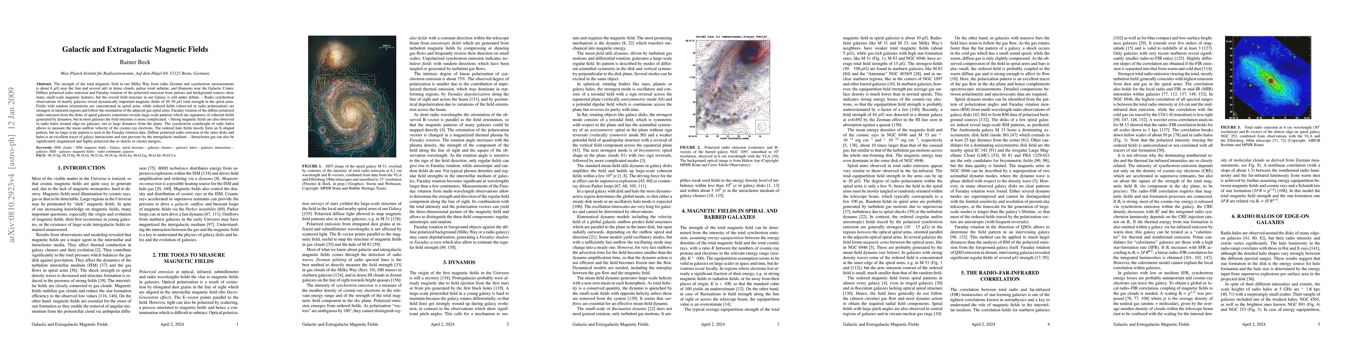 This paper investigates the magnetic fields in the Milky Way and nearby galaxies, finding that while the Galactic field strength ranges from 6 muG near the Sun to several mG in dense regions, the overall structure remains debated. Observations of nearby galaxies reveal magnetic fields of 10-30 muG in spiral arms, with ordered fields strongest in interarm regions, and large-scale patterns indicating coherent field generation by dynamos.