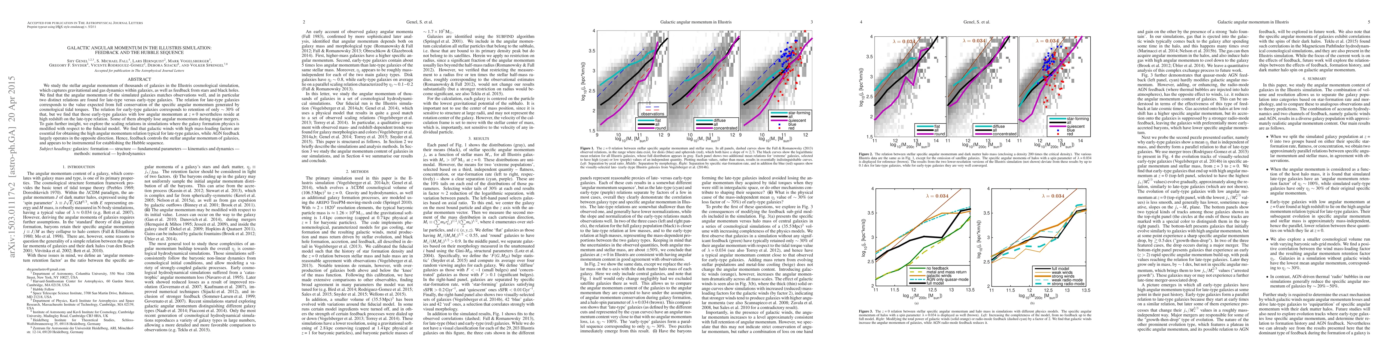 This paper examines the stellar angular momentum in galaxies from the Illustris simulation, finding that feedback mechanisms significantly influence the angular momentum distribution, with high-mass winds favoring the angular momentum typical of late-type galaxies and AGN feedback reducing it, thus shaping the Hubble sequence.