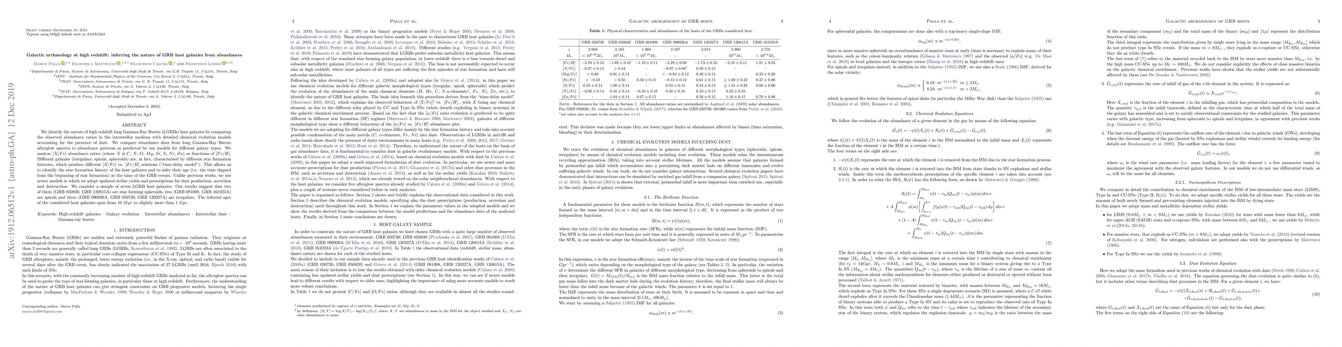 This paper identifies the nature of high redshift long Gamma-Ray Bursts (LGRBs) host galaxies by comparing observed interstellar medium abundances with detailed chemical evolution models. The study finds that two host galaxies are star-forming spheroids, two are spirals, and three are irregulars, with inferred ages ranging from 10 Myr to over 1 Gyr.