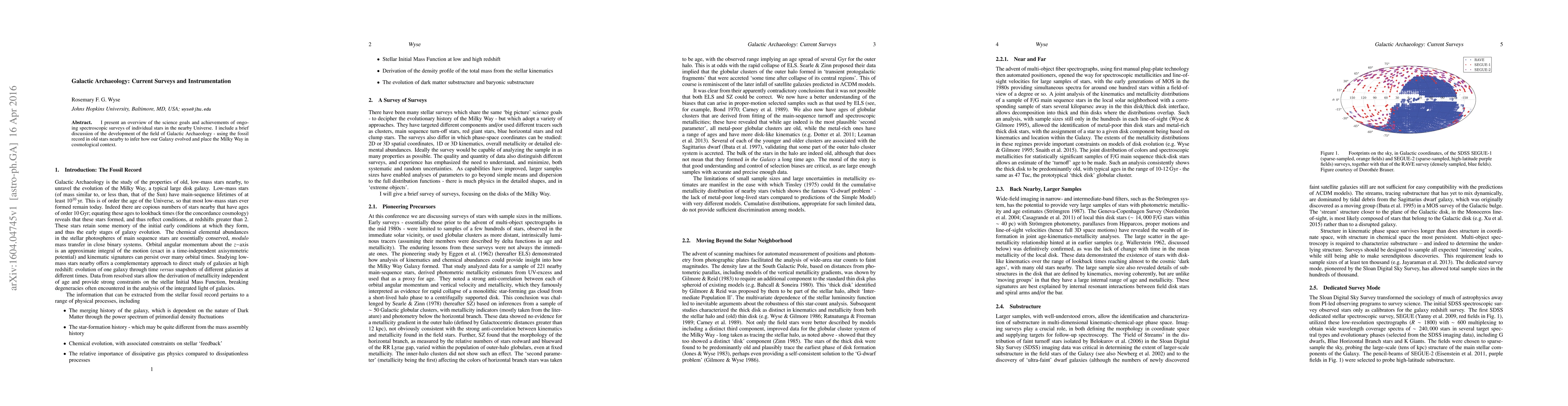 This paper reviews current spectroscopic surveys of nearby stars to study galaxy evolution and cosmology. It highlights key findings on how our Galaxy has evolved over time.