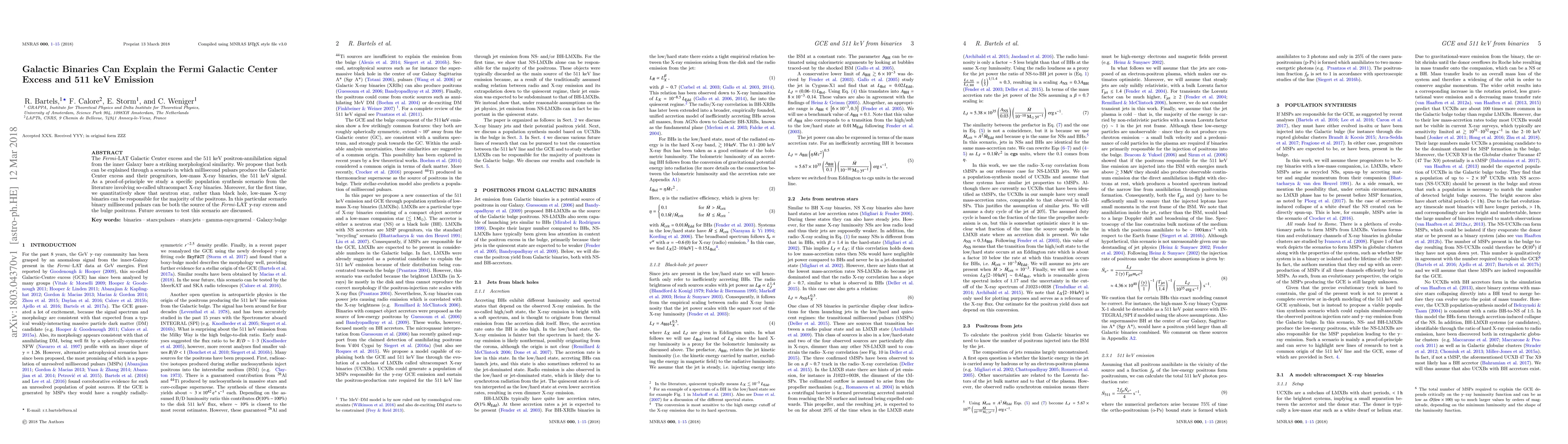 This paper proposes that galactic binaries, specifically millisecond pulsars and their progenitors, low-mass X-ray binaries, can explain the Fermi-LAT Galactic Center excess and the 511 keV positron-annihilation signal. It demonstrates that neutron star binaries are likely the primary source of positrons, offering a new perspective on these enigmatic emissions.