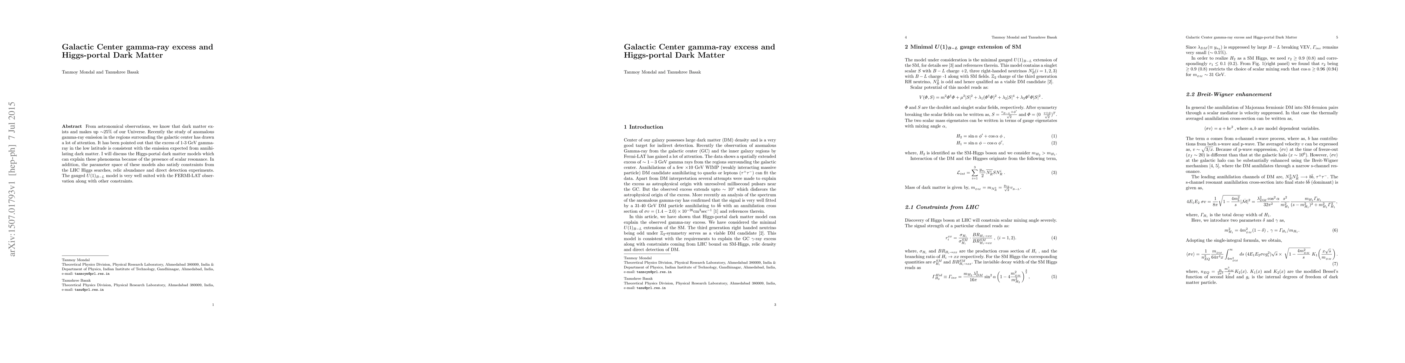 This paper investigates the galactic center gamma-ray excess, suggesting it aligns with dark matter annihilation, particularly through Higgs-portal dark matter models. The gauged $U(1)_{B-L}$ model is highlighted for its compatibility with Fermi-LAT observations and other experimental constraints.