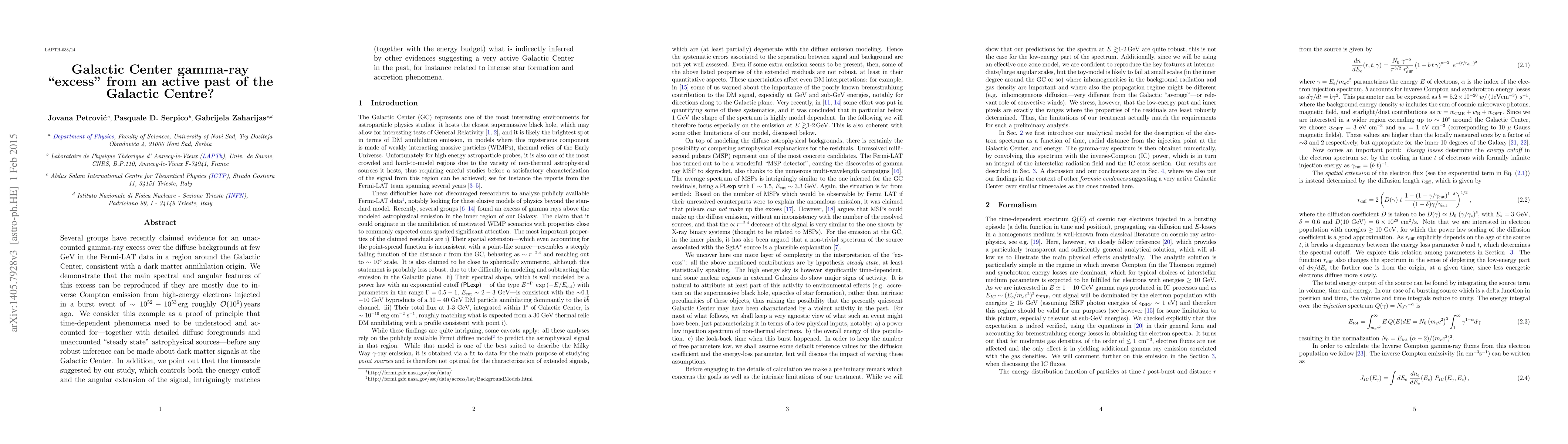 Several groups have recently claimed evidence for an unaccounted gamma-ray excess over {the} diffuse backgrounds at few GeV in {the} Fermi-LAT data in a region around the Galactic Center, consistent with a dark matter annihilation origin. We demonstrate that the main spectral and angular features of this excess can be reproduced if they are mostly due to inverse Compton emission from high-energy electrons injected in a burst event of ~10^52 - 10^53erg roughly O(10^6) years ago. We consider this example as a proof of principle that time-dependent phenomena need to be understood and accounted for - together with detailed diffuse foregrounds and unaccounted "steady state" astrophysical sources - before any robust inference can be made about dark matter signals at the Galactic Center. In addition, we point out that the timescale suggested by our study, which controls both the energy cutoff and the angular extension of the signal, intriguingly matches (together with the energy budget) what is indirectly inferred by other evidences suggesting a very active Galactic Center in the past, for instance related to intense star formation and accretion phenomena.
