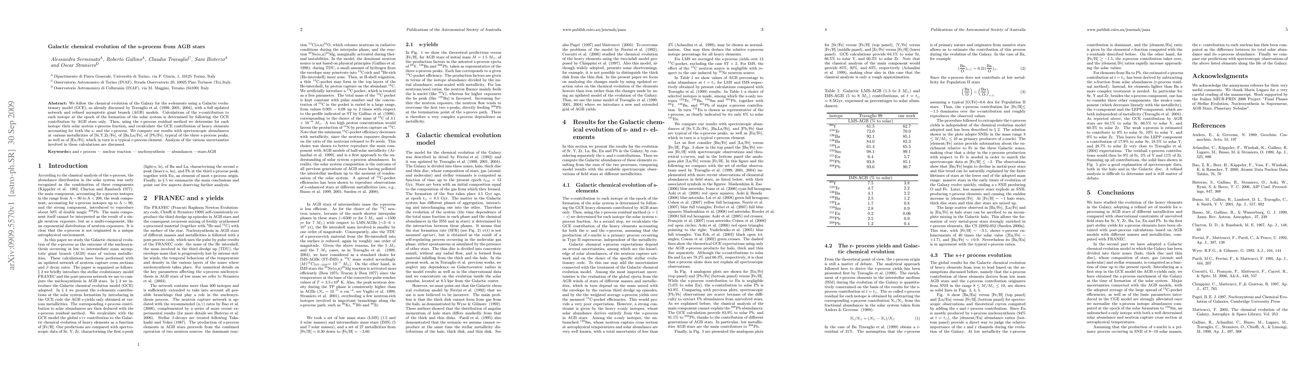 We follow the chemical evolution of the Galaxy for the s elements using a Galactic chemical evolution (GCE) model, as already discussed by Travaglio et al. (1999, 2001, 2004), with a full updated network and refined asymptotic giant branch (AGB) models. Calculations of the s contribution to each isotope at the epoch of the formation of the solar system is determined by following the GCE contribution by AGB stars only. Then, using the r-process residual method we determine for each isotope their solar system r-process fraction, and recalculate the GCE contribution of heavy elements accounting for both the s and r process. We compare our results with spectroscopic abundances at various metallicities of [Sr,Y,Zr/Fe], of [Ba,La/Fe], of [Pb/Fe], typical of the three s-process peaks, as well as of [Eu/Fe], which in turn is a typical r-process element. Analysis of the various uncertainties involved in these calculations are discussed.