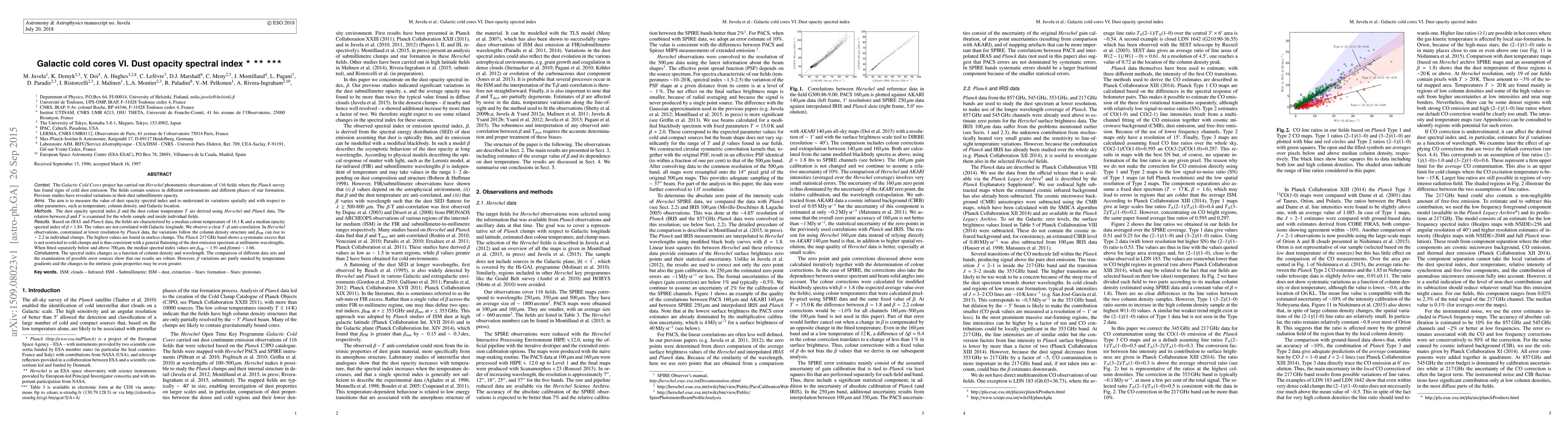 The Galactic Cold Cores project uses Herschel and Planck data to study dust opacity spectral indices and colour temperatures in 116 cold dust emission fields, revealing a T-beta anti-correlation and variations in beta linked to column density and wavelength. The study finds that beta can rise to ~2.2 in dense clumps and that the Planck 217 GHz band exhibits a systematic excess indicative of a flattening in the dust emission spectrum at millimetre wavelengths.