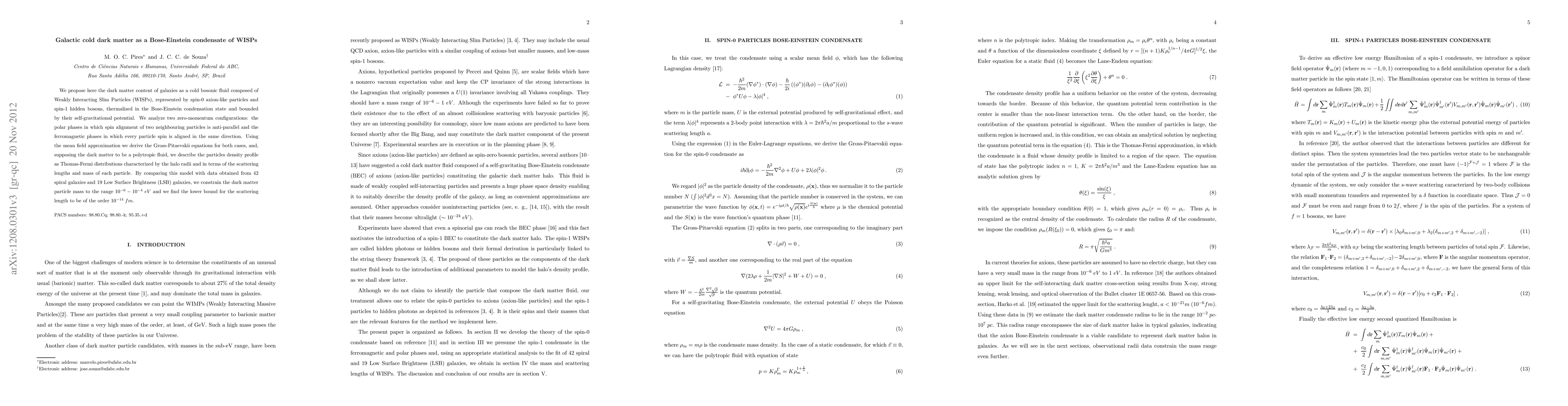 We propose here the dark matter content of galaxies as a cold bosonic fluid composed of Weakly Interacting Slim Particles (WISPs), represented by spin-0 axion-like particles and spin-1 hidden bosons, thermalized in the Bose-Einstein condensation state and bounded by their self-gravitational potential. We analyze two zero-momentum configurations: the polar phases in which spin alignment of two neighbouring particles is anti-parallel and the ferromagnetic phases in which every particle spin is aligned in the same direction. Using the mean field approximation we derive the Gross-Pitaevskii equations for both cases, and, supposing the dark matter to be a polytropic fluid, we describe the particles density profile as Thomas-Fermi distributions characterized by the halo radii and in terms of the scattering lengths and mass of each particle. By comparing this model with data obtained from 42 spiral galaxies and 19 Low Surface Brightness (LSB) galaxies, we constrain the dark matter particle mass to the range $10^{-6}-10^{-4} eV$ and we find the lower bound for the scattering length to be of the order $10^{-14} fm$.