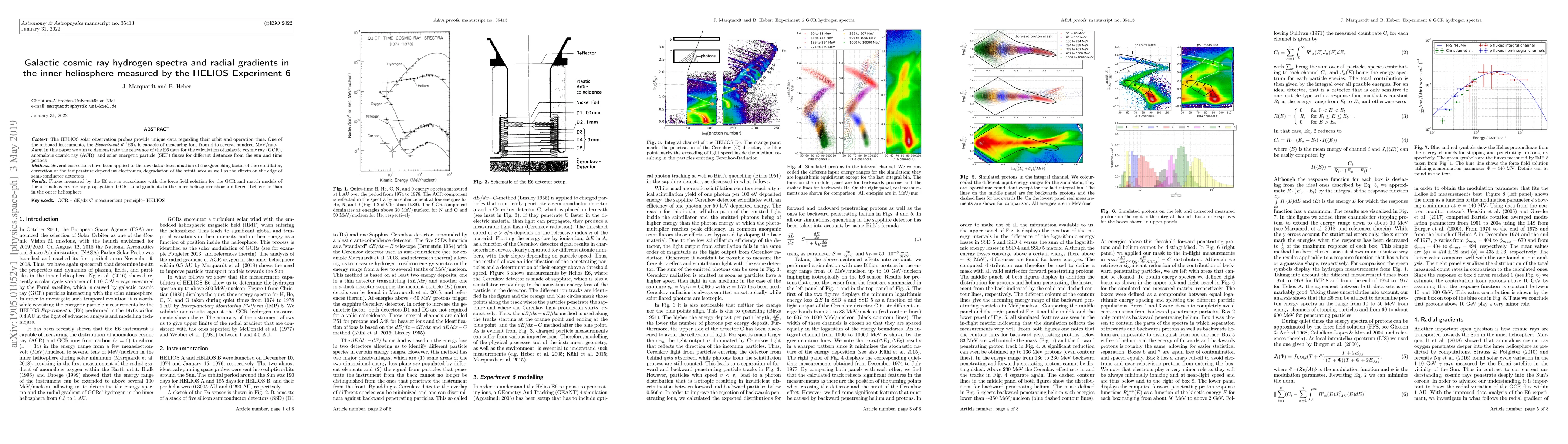 Context: The HELIOS solar observation probes provide unique data regarding their orbit and operation time. One of the onboard instruments, the Experiment 6 (E6), is capable of measuring ions from 4 to several hundred MeV/nuc. Aims: In this paper we aim to demonstrate the relevance of the E6 data for the calculation of galactic cosmic ray (GCR), anomolous cosmic ray (ACR), and solar energetic particle (SEP) fluxes for different distances from the sun and time periods. Methods: Several corrections have been applied to the raw data: determination of the Quenching factor of the scintillator, correction of the temperature dependent electronics, degradation of the scintillator as well as the effects on the edge of semi-conductor detectors. Results: Fluxes measured by the E6 are in accordance with the force field solution for the GCR and match models of the anomalous cosmic ray propagation. GCR radial gradients in the inner heliosphere show a different behaviour than in the outer heliosphere