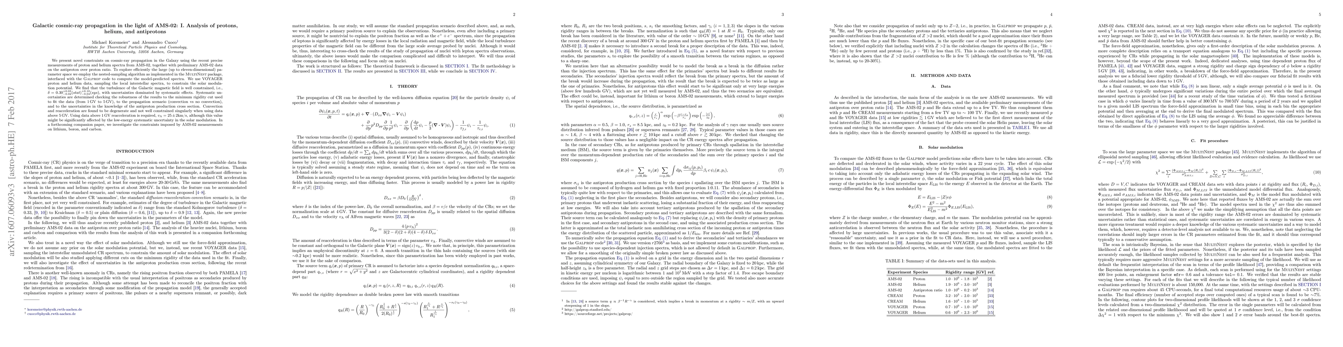 We present novel constraints on cosmic-ray propagation in the Galaxy using the recent precise measurements of proton and helium spectra from AMS-02, together with preliminary AMS-02 data on the antiproton over proton ratio. To explore efficiently the large (up to eleven-dimensional) parameter space we employ the nested-sampling algorithm as implemented in the \textsc{MultiNest} package, interfaced with the \textsc{Galprop} code to compute the model-predicted spectra. We use VOYAGER proton and helium data, sampling the local inter-stellar spectra, to constrain the solar modulation potential. We find that the turbulence of the Galactic magnetic field is well constrained, i.e., $\delta=0.30^{+0.03}_{-0.02}(stat)^{+0.10}_{-0.04}(sys)$, with uncertainties dominated by systematic effects. Systematic uncertainties are determined checking the robustness of the results to the minimum rigidity cut used to fit the data (from 1 GV to 5 GV), to the propagation scenario (convection vs no-convection), and to the uncertainties in the knowledge of the antiproton production cross section. Convection and reaccelaration are found to be degenerate and not well-constrained singularly when using data above 5 GV. Using data above 1 GV reacceleration is required, $v_{\rm A}=25\pm2$km/s, although this value might be significantly affected by the low energy systematic uncertainty in the solar modulation. In a forthcoming companion paper, we investigate the constraints imposed by AMS-02 measurements on lithium, boron, and carbon.