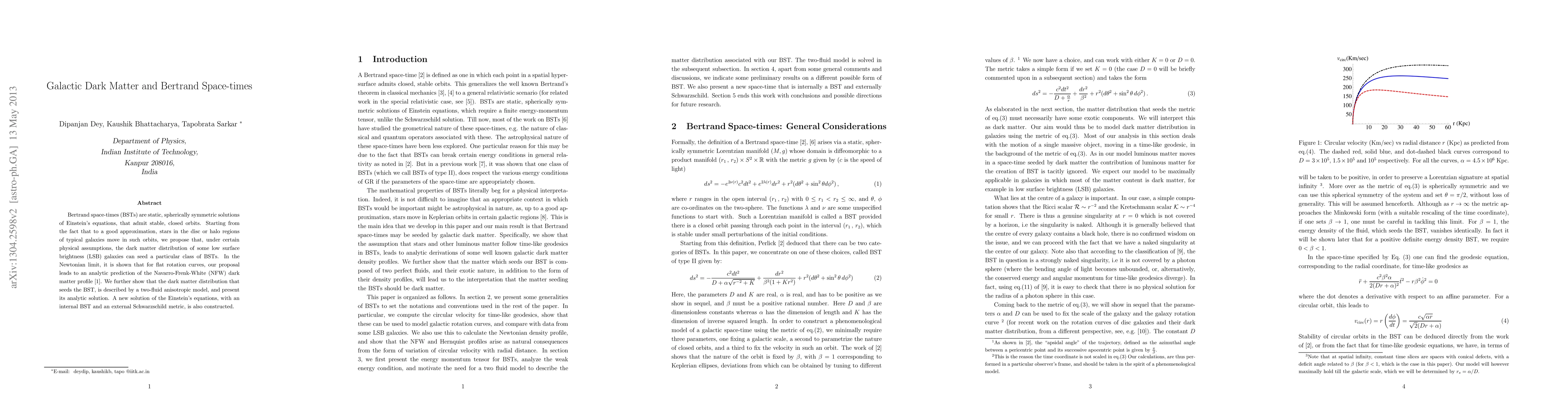 Bertrand space-times (BSTs) are static, spherically symmetric solutions of Einstein's equations, that admit stable, closed orbits. Starting from the fact that to a good approximation, stars in the disc or halo regions of typical galaxies move in such orbits, we propose that, under certain physical assumptions, the dark matter distribution of some low surface brightness (LSB) galaxies can seed a particular class of BSTs. In the Newtonian limit, it is shown that for flat rotation curves, our proposal leads to an analytic prediction of the NFW dark matter profile. We further show that the dark matter distribution that seeds the BST, is described by a two-fluid anisotropic model, and present its analytic solution. A new solution of the Einstein's equations, with an internal BST and an external Schwarzschild metric, is also constructed.