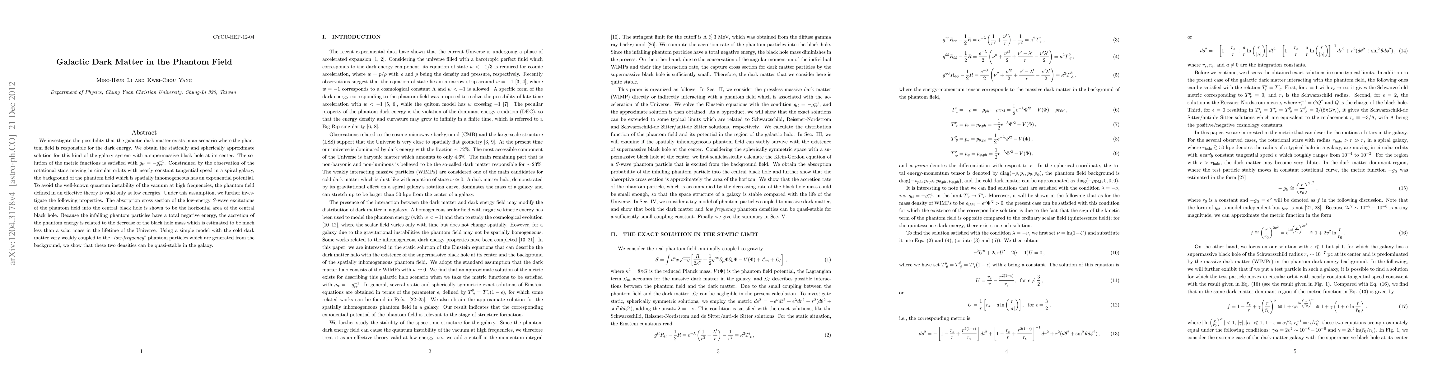This paper explores the hypothesis that galactic dark matter could be part of a phantom field responsible for dark energy, proposing a static and spherically symmetric solution for a galaxy with a central black hole. It demonstrates that the phantom field's absorption into the black hole leads to a negligible decrease in black hole mass and suggests that cold dark matter and low-frequency phantom particles can coexist quasi-stable in a galaxy.