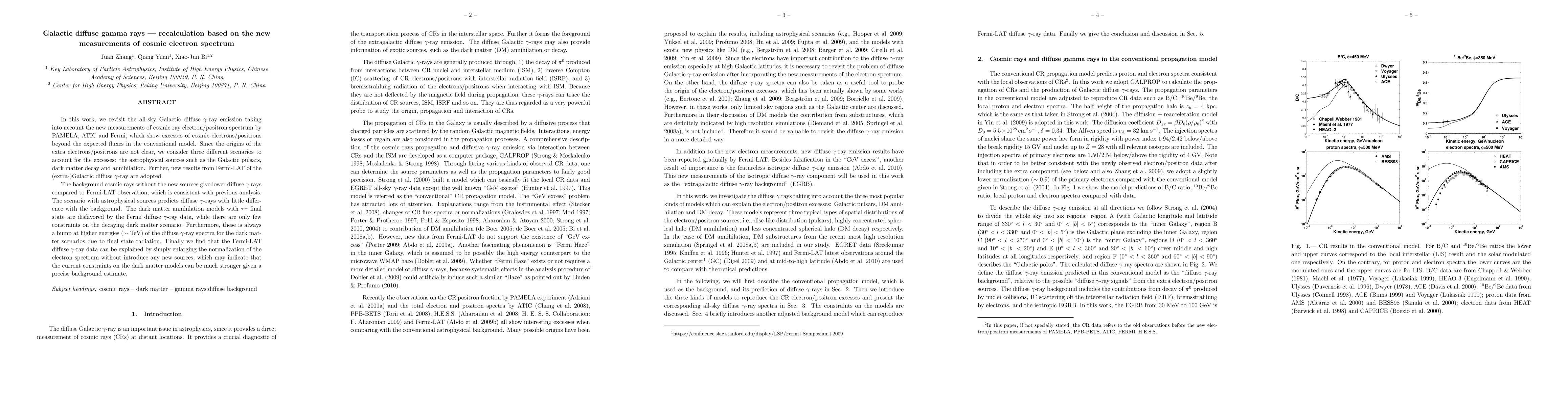 This paper recalculates the Galactic diffuse gamma-ray emission considering new cosmic electron/positron spectrum measurements, which suggest excesses beyond conventional models. The study explores three scenarios for these excesses: astrophysical sources, dark matter decay, and dark matter annihilation, with Fermi-LAT data indicating that dark matter annihilation models with $\tau^{\pm}$ are disfavored.