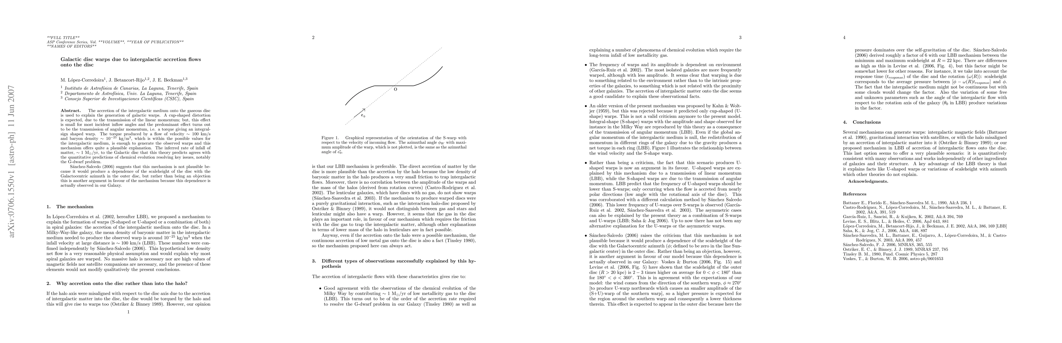 The accretion of the intergalactic medium onto the gaseous disc is used to explain the generation of galactic warps. A cup-shaped distortion is expected, due to the transmission of the linear momentum; but, this effect is small for most incident inflow angles and the predominant effect turns out to be the transmission of angular momentum, i.e. a torque giving an integral-sign shaped warp. The torque produced by a flow of velocity ~100 km/s and baryon density ~10^{-25} kg/m^3, which is within the possible values for the intergalactic medium, is enough to generate the observed warps and this mechanism offers quite a plausible explanation. The inferred rate of infall of matter, ~1 M_sun/yr, to the Galactic disc that this theory predicts agrees with the quantitative predictions of chemical evolution resolving key issues, notably the G-dwarf problem. Sanchez-Salcedo (2006) suggests that this mechanism is not plausible because it would produce a dependence of the scaleheight of the disc with the Galactocentric azimuth in the outer disc, but rather than being an objection this is another argument in favour of the mechanism because this dependence is actually observed in our Galaxy.