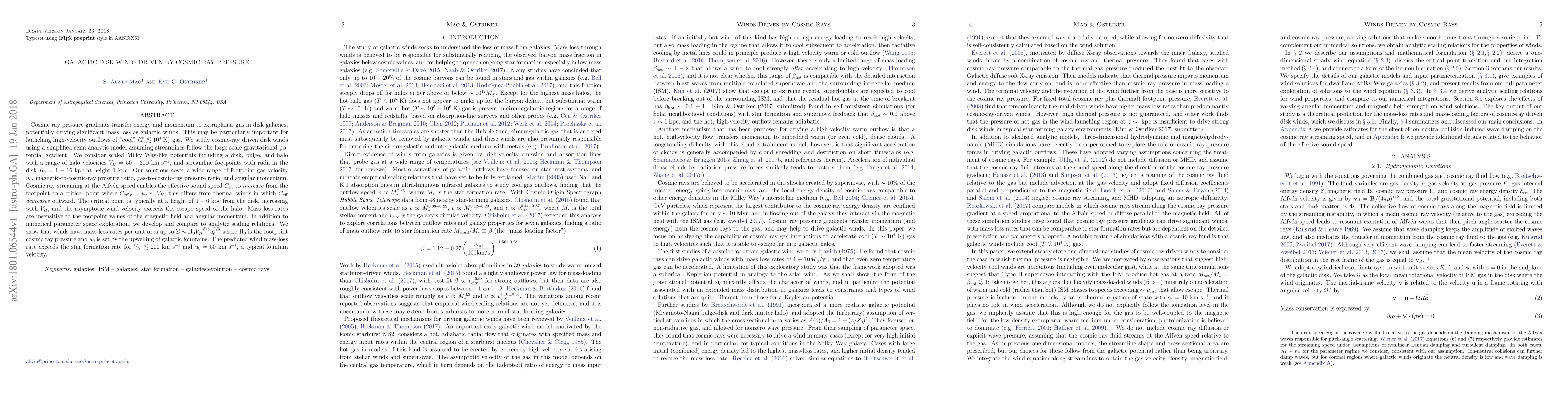 This paper investigates galactic disk winds driven by cosmic ray pressure, finding that cosmic rays can significantly drive mass loss in galaxies. The study uses a semi-analytic model to explore the dynamics of these winds, showing that the effective sound speed increases with height, leading to high-velocity outflows of cool gas. The mass loss rate exceeds star formation rates under typical conditions.