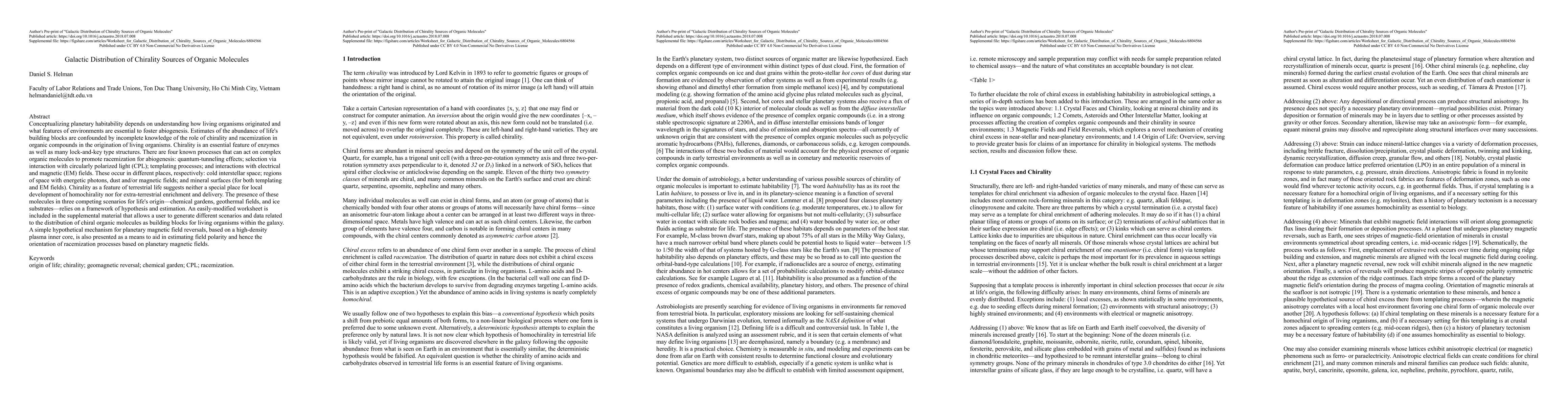 Conceptualizing planetary habitability depends on understanding how living organisms originated and what features of environments are essential to foster abiogenesis. Estimates of the abundance of life's building blocks are confounded by incomplete knowledge of the role of chirality and racemization in organic compounds in the origination of living organisms. Chirality is an essential feature of enzymes as well as many lock-and-key type structures. There are four known processes that can act on complex organic molecules to promote racemization for abiogenesis: quantum-tunneling effects; selection via interaction with circularly polarized light (CPL); templating processes; and interactions with electrical and magnetic (EM) fields. These occur in different places, respectively: cold interstellar space; regions of space with energetic photons, dust and/or magnetic fields; and mineral surfaces (for both templating and EM fields). Chirality as a feature of terrestrial life suggests neither a special place for local development of homochirality nor for extra-terrestrial enrichment and delivery. The presence of these molecules in three competing scenarios for life's origin - chemical gardens, geothermal fields, and ice substrates - relies on a framework of hypothesis and estimation. An easily-modified worksheet is included in the supplemental material that allows a user to generate different scenarios and data related to the distribution of chiral organic molecules as building blocks for living organisms within the galaxy. A simple hypothetical mechanism for planetary magnetic field reversals, based on a high-density plasma inner core, is also presented as a means to aid in estimating field polarity and hence the orientation of racemization processes based on planetary magnetic fields.