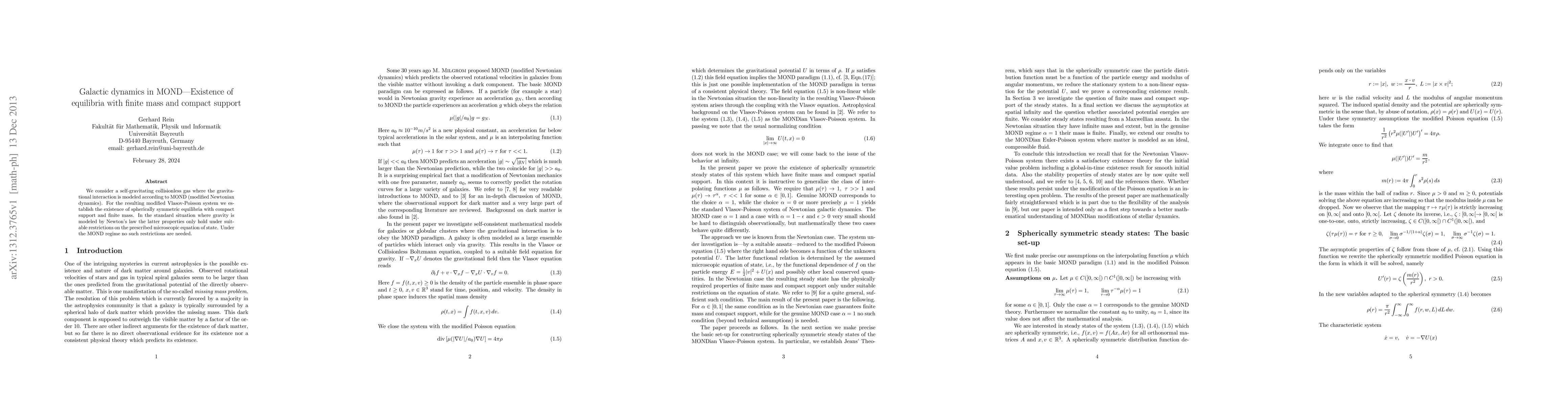 This paper establishes the existence of spherically symmetric equilibria in a self-gravitating collisionless gas under modified Newtonian dynamics (MOND), showing that these equilibria can have finite mass and compact support without the restrictions required for Newtonian gravity.