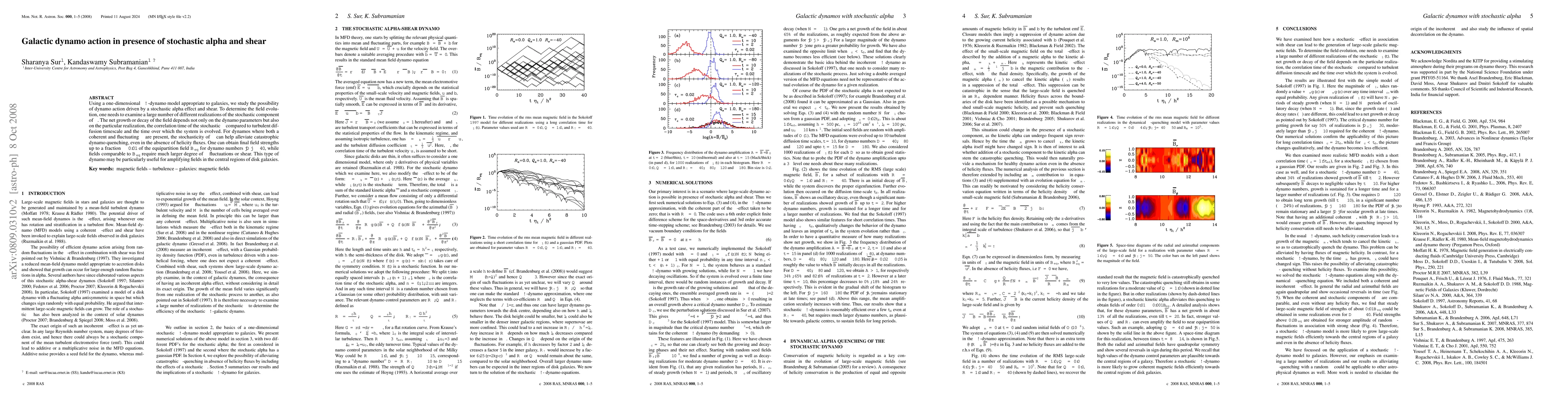 This paper investigates the impact of stochastic alpha effects and shear on galactic dynamo action in a one-dimensional $\alpha\omega$-dynamo model. It finds that stochasticity can mitigate dynamo quenching, enabling field strengths up to 0.01 times the equipartition field for moderate dynamo numbers, suggesting potential for amplifying fields in disk galaxies.