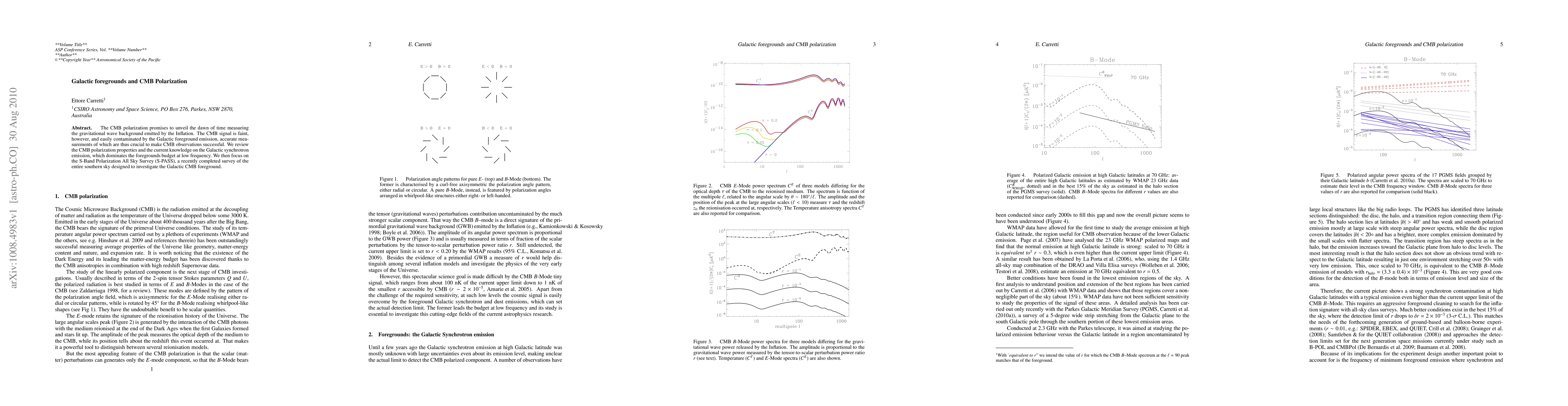 This paper reviews the properties of CMB polarization and the contamination from Galactic foreground emissions, particularly synchrotron radiation, which is significant at low frequencies. It highlights the S-PASS survey, which aims to map and mitigate these foregrounds for accurate CMB observations.