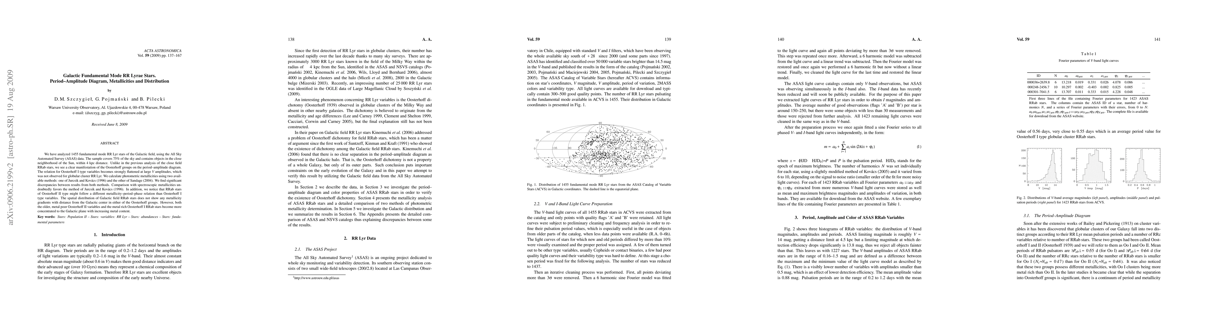 This study analyzes 1455 fundamental mode RR Lyrae stars using ASAS data, revealing distinct Oosterhoff groups on the period-amplitude diagram and significant discrepancies in calculated photometric metallicities, favoring the Jurcsik & Kovacs method. The spatial distribution shows no metallicity gradients with distance from the Galactic Center but indicates increasing concentration towards the Galactic plane with higher metal content.