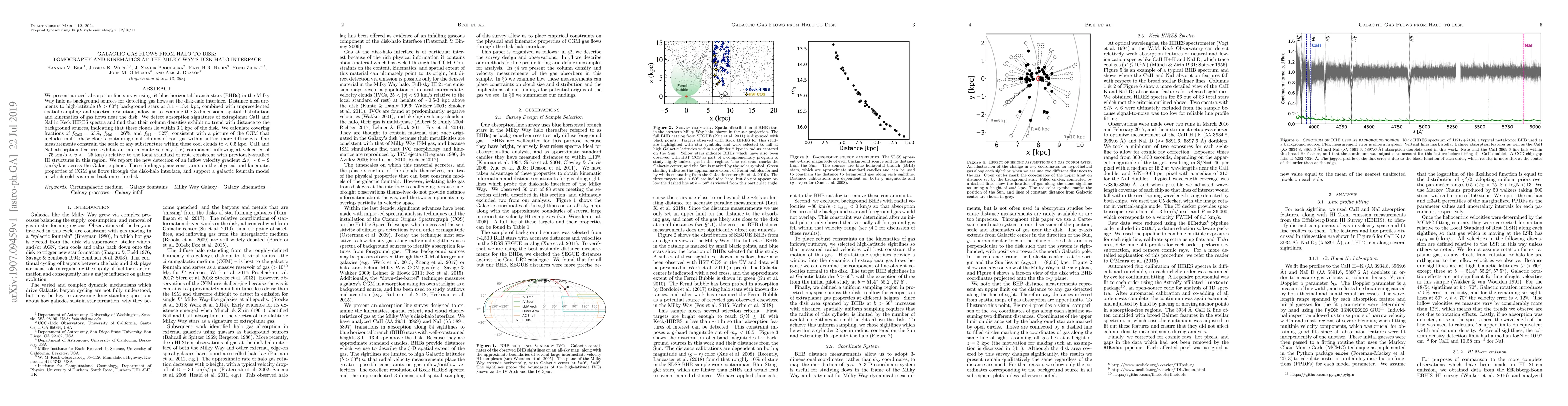 We present a novel absorption line survey using 54 blue horizontal branch stars (BHBs) in the Milky Way halo as background sources for detecting gas flows at the disk-halo interface. Distance measurements to high-latitude ($b$ > 60{\deg}) background stars at 3.1-13.4 kpc, combined with unprecedented spatial sampling and spectral resolution, allow us to examine the 3-dimensional spatial distribution and kinematics of gas flows near the disk. We detect absorption signatures of extraplanar CaII and NaI in Keck HIRES spectra and find that their column densities exhibit no trend with distance to the background sources, indicating that these clouds lie within 3.1 kpc of the disk. We calculate covering fractions of $f_{CaII}$ = 63%, $f_{NaI}$ = 26%, and $f_{HI}$ = 52%, consistent with a picture of the CGM that includes multi-phase clouds containing small clumps of cool gas within hotter, more diffuse gas. Our measurements constrain the scale of any substructure within these cool clouds to <0.5 kpc. CaII and NaI absorption features exhibit an intermediate-velocity (IV) component inflowing at velocities of -75 km/s < v < -25 km/s relative to the local standard of rest, consistent with previously-studied HI structures in this region. We report the new detection of an inflow velocity gradient ${\Delta}v_z$ ~ 6-9 km/s/kpc across the Galactic plane. These findings place constraints on the physical and kinematic properties of CGM gas flows through the disk-halo interface, and support a galactic fountain model in which cold gas rains back onto the disk.