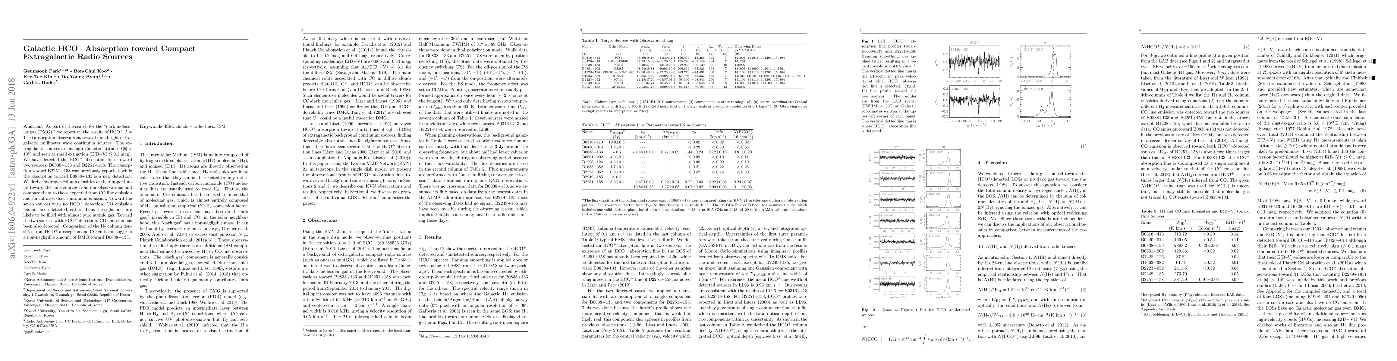 This paper reports HCO$^+$ J = 1-0 absorption observations toward nine extragalactic radio sources, detecting absorption in two sources and suggesting the presence of dark molecular gas in one. The study finds that sight lines without HCO$^+$ detection likely contain almost pure atomic gas.