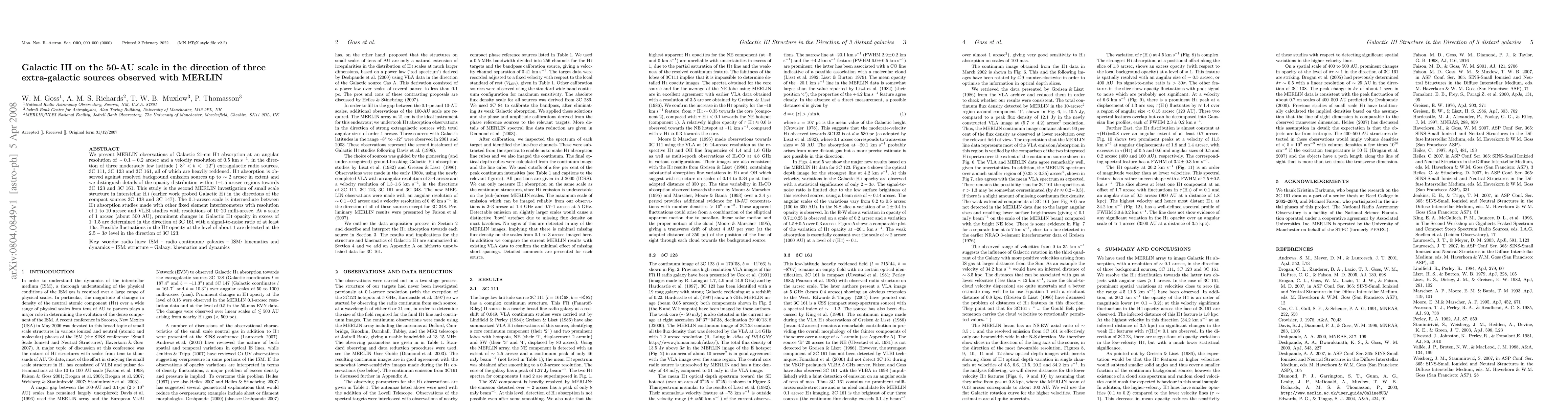This study uses MERLIN observations to analyze Galactic 21-cm HI absorption at high angular resolution towards three extragalactic radio sources, revealing significant variations in HI opacity on the 50-AU scale. Prominent changes in HI opacity are detected towards 3C161, with possible fluctuations detected towards 3C123.