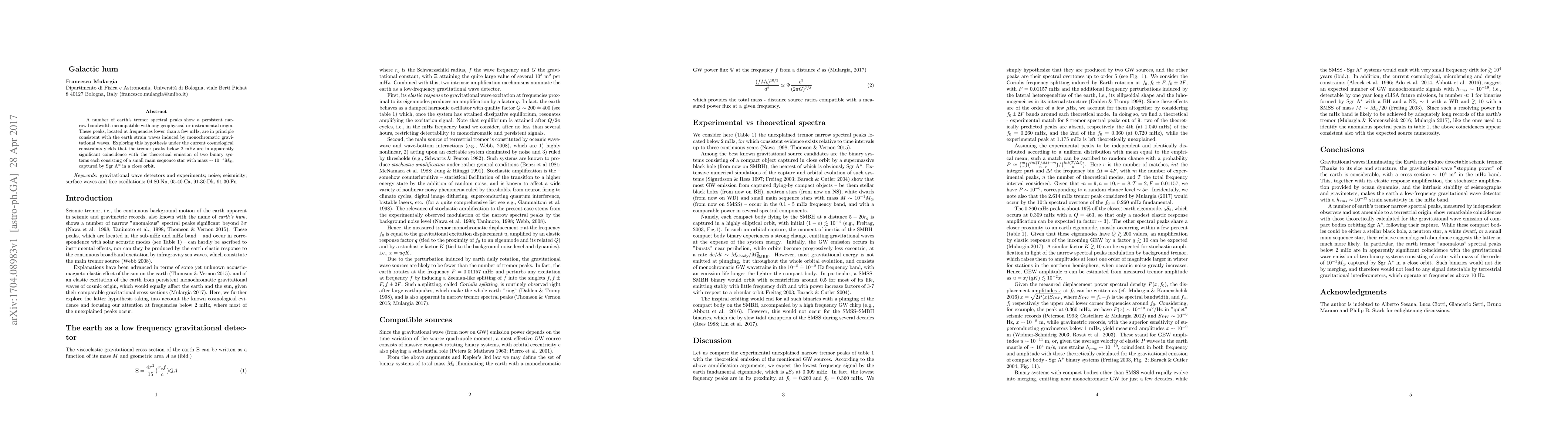 A number of earth's tremor spectral peaks show a persistent narrow bandwidth incompatible with any geophysical or instrumental origin. These peaks, located at frequencies lower than a few mHz, are in principle consistent with the earth strain waves induced by monochromatic gravitational waves. Exploring this hypothesis under the current cosmological constraints yields that the tremor peaks below 2 mHz are in apparently significant coincidence with the theoretical emission of two binary systems each consisting of a small main sequence star with mass $\sim 10^{-1} M_{\odot}$, captured by Sgr A* in a close orbit.