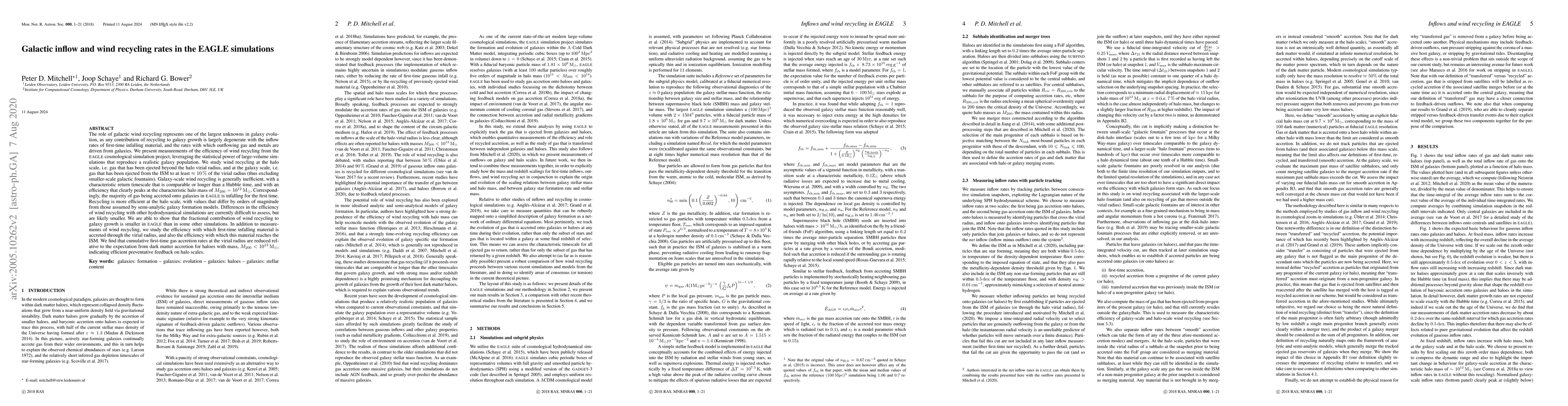 The EAGLE simulations reveal that wind recycling in galaxies is inefficient, with most gas accreted being first-time infalling material. At the halo scale, recycling efficiency is significantly lower than in semi-analytic models, indicating strong preventative feedback for lower-mass haloes.