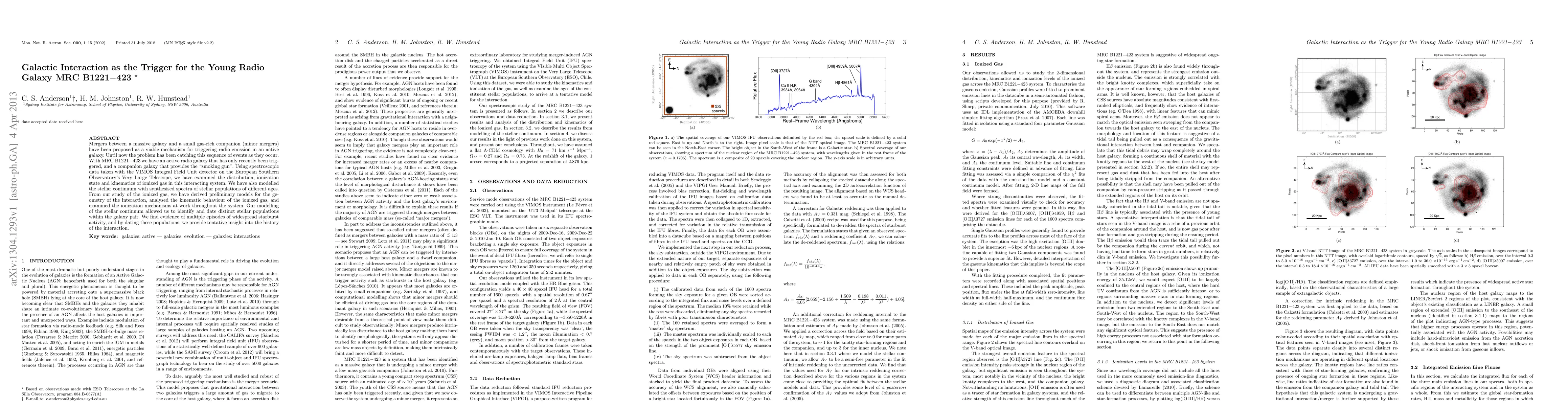 Mergers between a massive galaxy and a small gas-rich companion (minor mergers) have been proposed as a viable mechanism for triggering radio emission in an active galaxy. Until now the problem has been catching this sequence of events as they occur. With MRC B1221$-$423 we have an active radio galaxy that has only recently been triggered, and a companion galaxy that provides the "smoking gun". Using spectroscopic data taken with the VIMOS Integral Field Unit detector on the European Southern Observatory's Very Large Telescope, we have examined the distribution, ionization state and kinematics of ionized gas in this interacting system. We have also modelled the stellar continuum with synthesised spectra of stellar populations of different ages. From our study of the ionized gas, we have derived preliminary models for the geometry of the interaction, analysed the kinematic behaviour of the ionized gas, and examined the ionization mechanisms at work throughout the system. Our modelling of the stellar continuum allowed us to identify and date distinct stellar populations within the galaxy pair. We find evidence of multiple episodes of widespread starburst activity, and by dating these populations, we provide tentative insight into the history of the interaction.