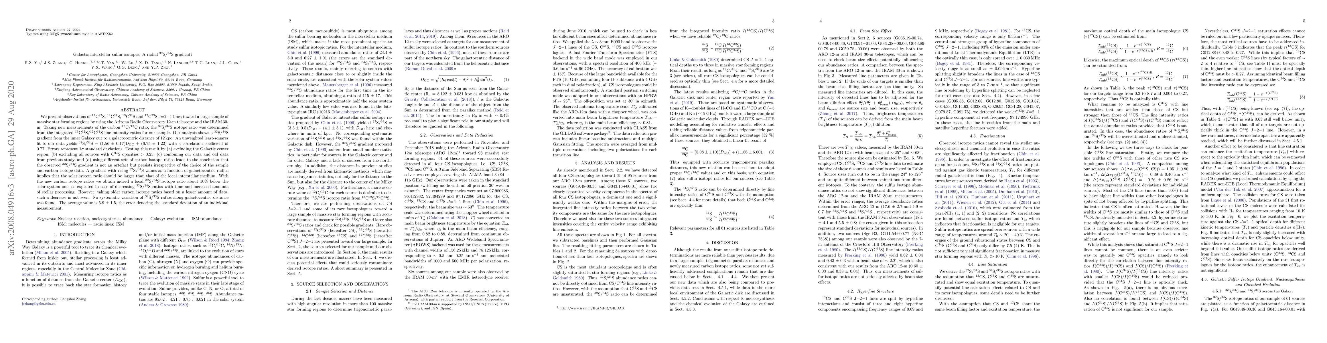 We present observations of $^{12}$C$^{32}$S, $^{12}$C$^{34}$S, $^{13}$C$^{32}$S and $^{12}$C$^{33}$S J=2$-$1 lines toward a large sample of massive star forming regions by using the Arizona Radio Observatory 12-m telescope and the IRAM\,30-m. Taking new measurements of the carbon $^{12}$C/$^{13}$C ratio, the $^{32}$S$/$$^{34}$S isotope ratio was determined from the integrated $^{13}$C$^{32}$S/$^{12}$C$^{34}$S line intensity ratios for our sample. Our analysis shows a $^{32}$S$/$$^{34}$S gradient from the inner Galaxy out to a galactocentric distance of 12\,kpc. An unweighted least-squares fit to our data yields $^{32}$S$/$$^{34}$S = (1.56 $\pm$ 0.17)$\rm D_{\rm GC}$ + (6.75 $\pm$ 1.22) with a correlation coefficient of 0.77. Errors represent 1$\sigma$ standard deviations. Testing this result by (a) excluding the Galactic center region, (b) excluding all sources with C$^{34}$S opacities $>$ 0.25, (c) combining our data and old data from previous study, and (d) using different sets of carbon isotope ratios leads to the conclusion that the observed $^{32}$S$/$$^{34}$S gradient is not an artefact but persists irrespective of the choice of the sample and carbon isotope data. A gradient with rising $^{32}$S$/$$^{34}$S values as a function of galactocentric radius implies that the solar system ratio should be larger than that of the local interstellar medium. With the new carbon isotope ratios we obtain indeed a local $^{32}$S$/$$^{34}$S isotope ratio about 10$\%$ below the solar system one, as expected in case of decreasing $^{32}$S$/$$^{34}$S ratios with time and increased amounts of stellar processing. However, taking older carbon isotope ratios based on a lesser amount of data, such a decrease is not seen. No systematic variation of $^{34}$S$/$$^{33}$S ratios along galactocentric distance was found.
