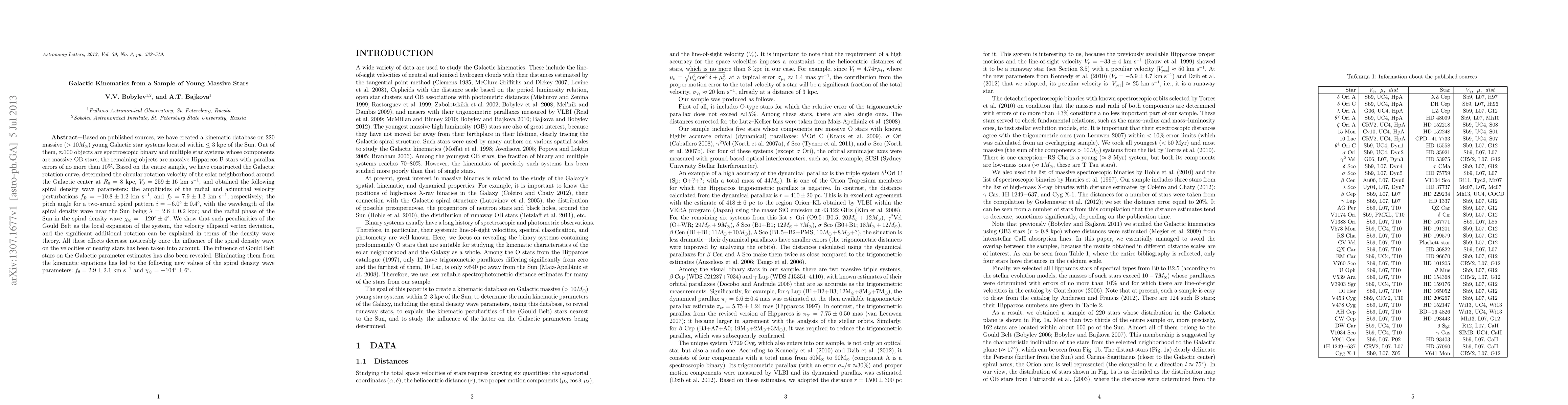 Based on published sources, we have created a kinematic database on 220 massive (>10 solar masses) young Galactic star systems located within <3 kpc of the Sun. Out of them, approximately 100 objects are spectroscopic binary and multiple star systems whose components are massive OB stars; the remaining objects are massive Hipparcos B stars with parallax errors of no more than 10 percent. Based on the entire sample, we have constructed the Galactic rotation curve, determined the circular rotation velocity of the solar neighborhood around the Galactic center at Ro=8 kpc, Vo=259+-16 km/s, and obtained the following spiral density wave parameters: the amplitudes of the radial and azimuthal velocity perturbations f_R=-10.8+/-1.2 km/s, and f_\theta=7.9+/-1.3 km/s, respectively; the pitch angle for a two-armed spiral pattern i=-6.0+/-0.4 deg., with the wavelength of the spiral density wave near the Sun being 2.6+/-0.2 kpc; and the radial phase of the Sun in the spiral density wave -120+/-4 deg. We show that such peculiarities of the Gould Belt as the local expansion of the system, the velocity ellipsoid vertex deviation, and the significant additional rotation can be explained in terms of the density wave theory. All these effects decrease noticeably once the influence of the spiral density wave on the velocities of nearby stars has been taken into account. The influence of Gould Belt stars on the Galactic parameter estimates has also been revealed. Eliminating them from the kinematic equations has led to the following new values of the spiral density wave parameters: f_\theta=2.9+/-2.1 km/s and \chi_\odot=-104+/-6 deg.