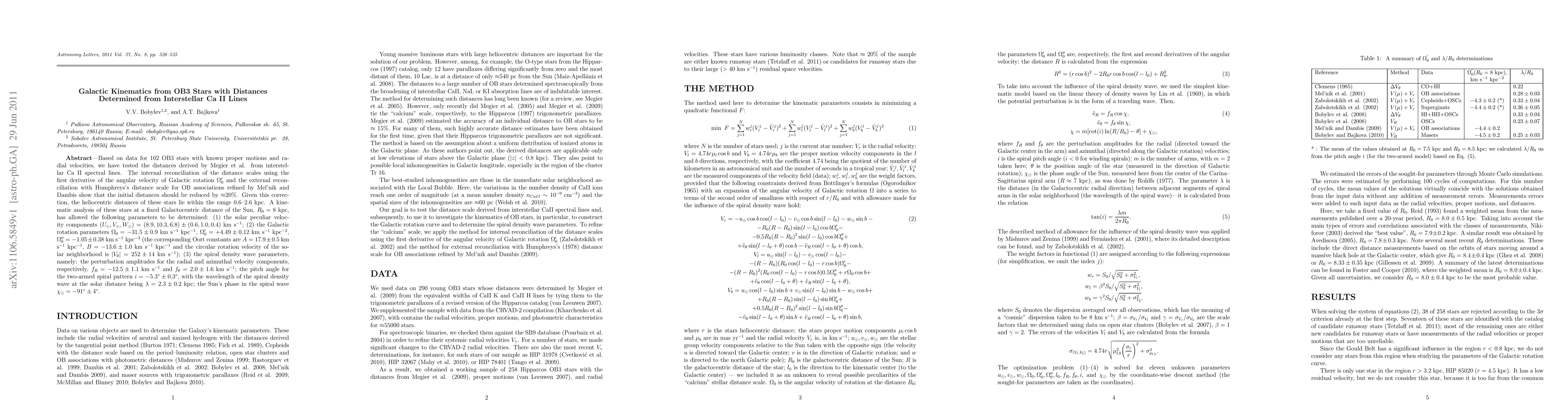 Based on data for 102 OB3 stars with known proper motions and radial velocities, we have tested the distances derived by Megier et al. from interstellar Ca II spectral lines. The internal reconciliation of the distance scales using the first derivative of the angular velocity of Galactic rotation {\Omega}'0 and the external reconciliation with Humphreys's distance scale for OB associations refined by Mel'nik and Dambis show that the initial distances should be reduced by \approx 20%. Given this correction, the heliocentric distances of these stars lie within the range 0.6-2.6 kpc. A kinematic analysis of these stars at a fixed Galactocentric distance of the Sun, R0=8 kpc, has allowed the following parameters to be determined:(1) the solar peculiar velocity components (U_o,V_o,W_o)=(8.9,10.3,6.8)\pm(0.6,1.0,0.4) km/s;(2) the Galactic rotation parameters {\Omega}_o=-31.5\pm0.9 km/s/kpc, {\Omega}'_o=+4.49\pm0.12 km/s/kpc^2, {\Omega}"_o=-1.05\pm0.38 km/s/kpc^3, (the corresponding Oort constants are A=17.9\pm0.5 km/s/kpc, B=-13.6\pm1.0 km/s/kpc and the circular rotation velocity of the solar neighborhood is |V_o|=252\pm14 km/s); (3) the spiral density wave parameters, namely: the perturbation amplitudes for the radial and azimuthal velocity components, respectively, f_R = -12.5\pm1.1 km/s and f_{\theta}=2.0\pm1.6 km/s; the pitch angle for the two-armed spiral pattern i=-5.3\pm0.3 degrees, with the wavelength of the spiral density wave at the solar distance being {\lambda}=2.3\pm0.2 kpc; the Sun's phase in the spiral wave {\chi}_o=-91\pm4 degrees.