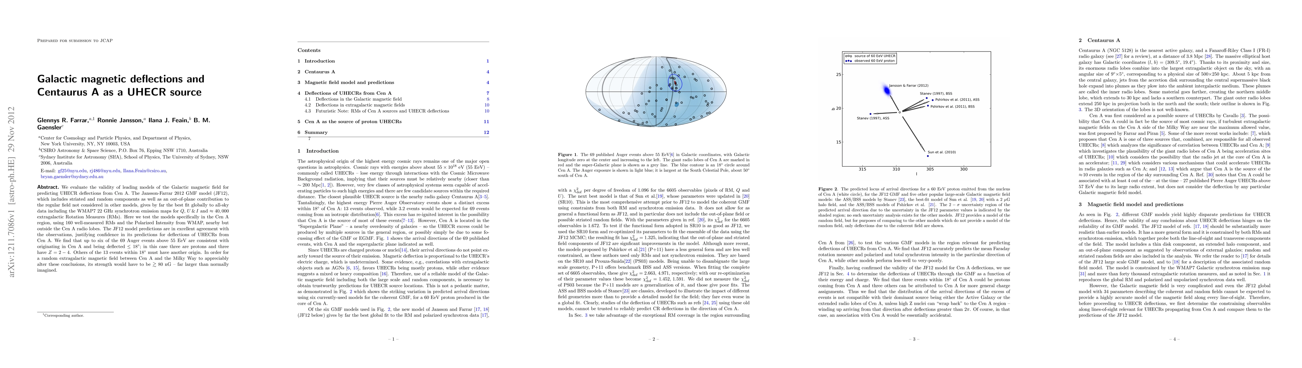 This paper evaluates the Jansson-Farrar 2012 Galactic magnetic field model for predicting ultra-high-energy cosmic ray (UHECR) deflections from Centaurus A. The model's predictions align well with observations, supporting its use for Cen A's UHECR deflections, with six of the 69 Auger events potentially originating from Cen A.