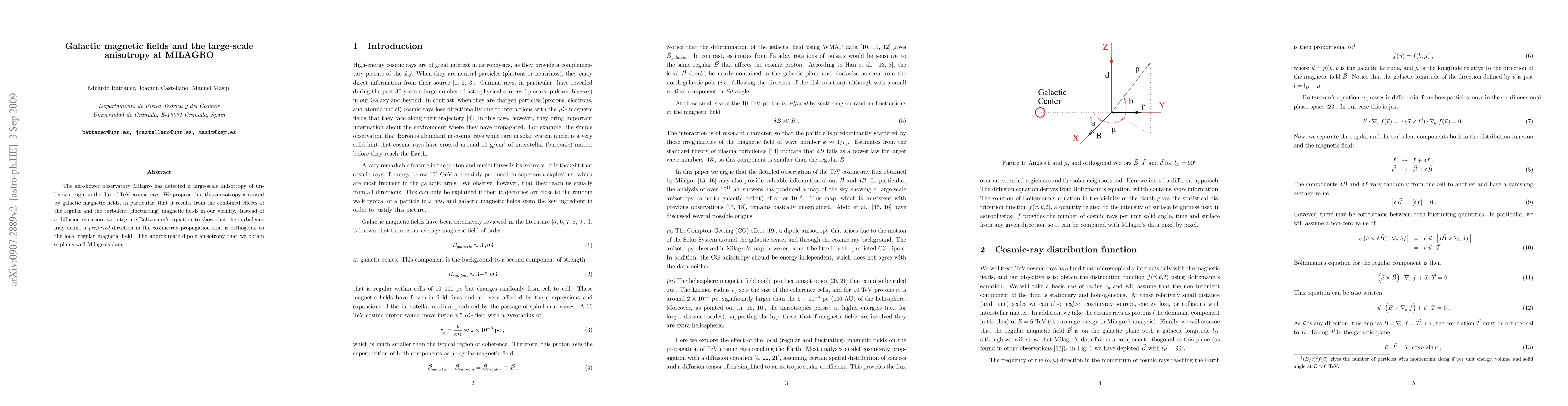 The Milagro observatory detected a large-scale anisotropy in TeV cosmic rays, likely due to galactic magnetic fields. The study suggests that both regular and turbulent magnetic fields create a preferred direction orthogonal to the local regular field, explaining the observed anisotropy.