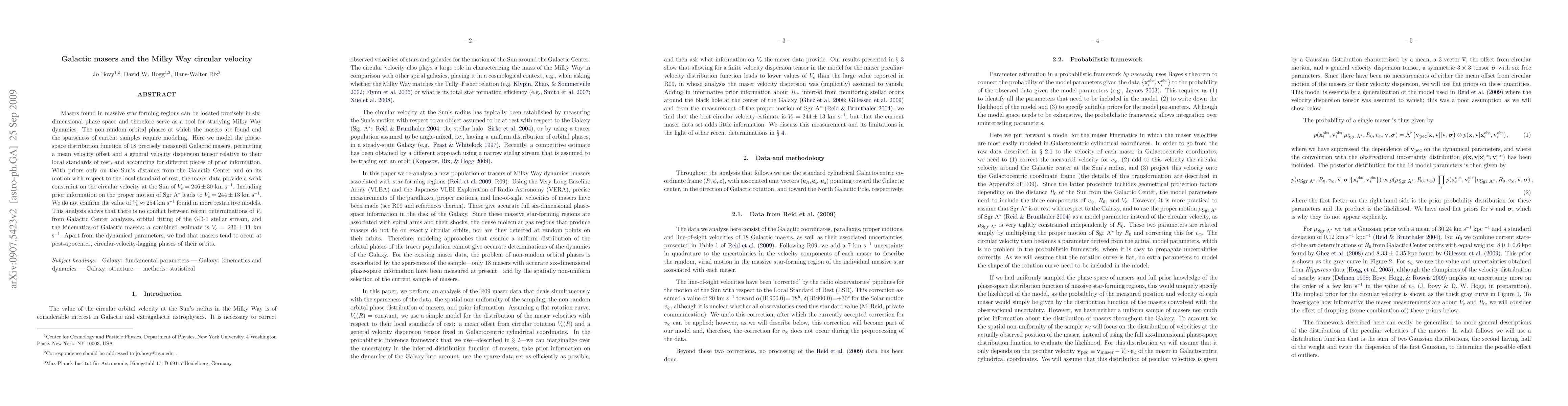 This study models the motion of Galactic masers to estimate the Milky Way's circular velocity near the Sun, finding V_c = 246 ± 30 km/s with limited priors and V_c = 244 ± 13 km/s with additional Sgr A* prior info. The analysis reconciles disparate V_c estimates, concluding a combined V_c = 236 ± 11 km/s, and reveals masers often occur at orbit phases lagging the circular velocity.