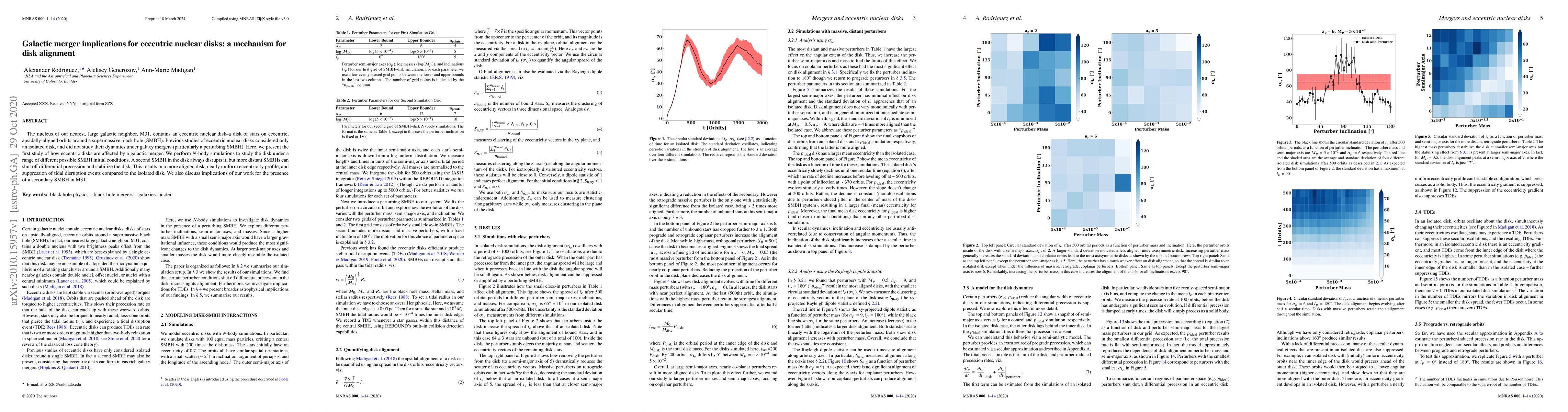This study investigates the dynamics of eccentric nuclear disks in galaxy mergers, finding that a secondary supermassive black hole (SMBH) can disrupt the disk unless it is sufficiently distant. Distant SMBHs stabilize the disk, leading to alignment and a uniform eccentricity profile, with implications for understanding the structure of M31's nuclear disk.