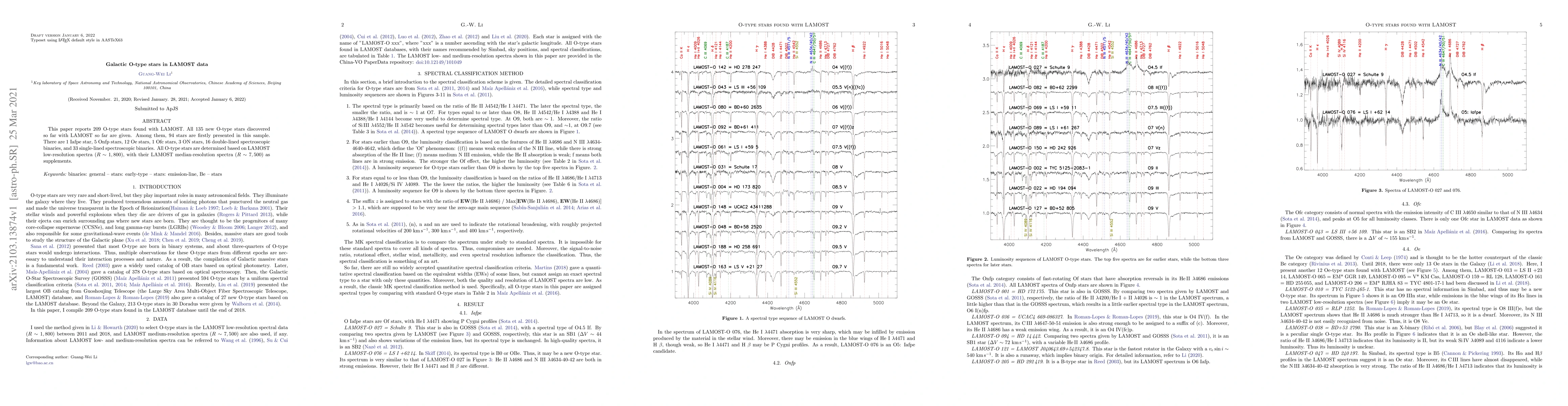 This paper identifies 209 O-type stars using LAMOST data, including 94 new discoveries, characterized by various spectral types and binary classifications. The classification is primarily based on LAMOST low-resolution spectra, supplemented by median-resolution spectra.